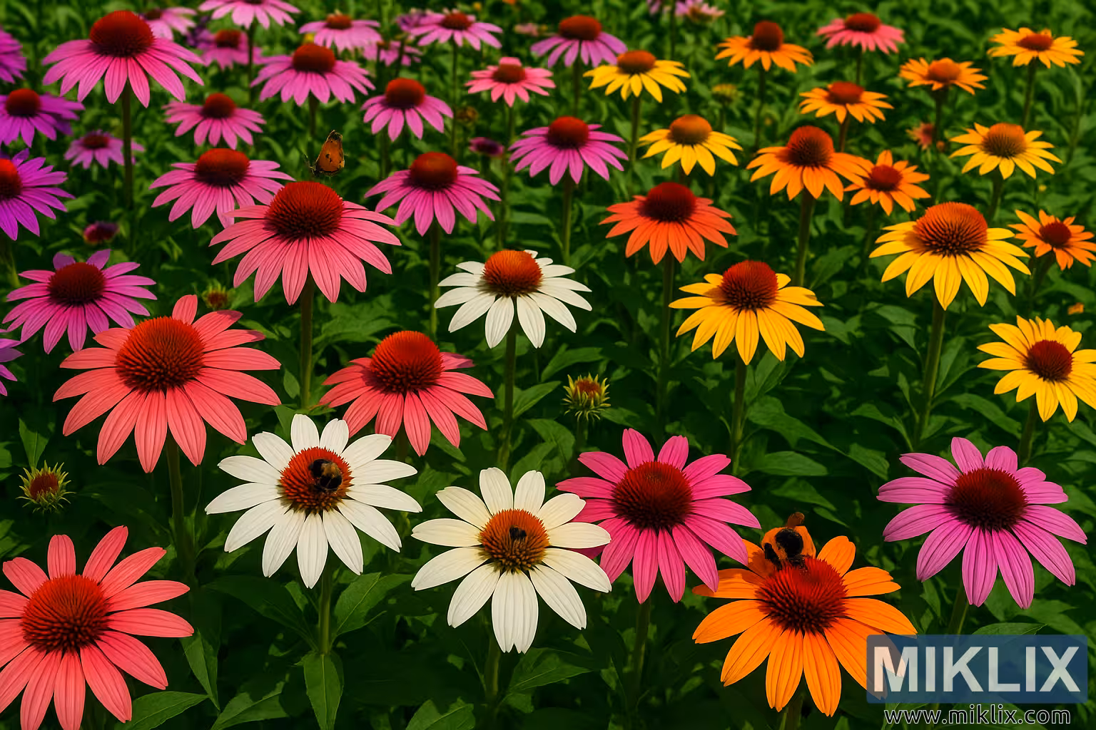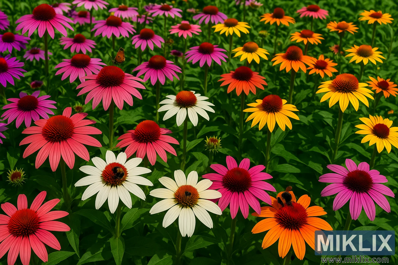 Image du paysage d’un champ vibrant d’échinacées en pleine floraison—rose, violet, blanc, jaune et orange—animé d’abeilles et d’un papillon par une journée d’été ensoleillée.