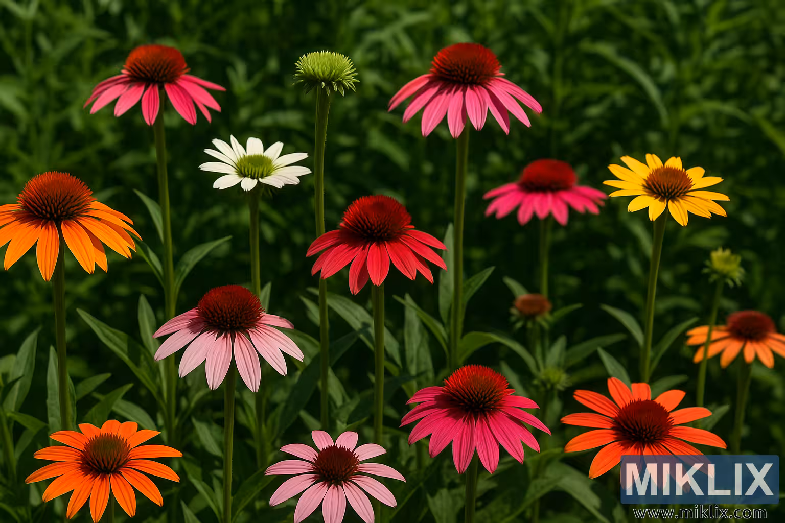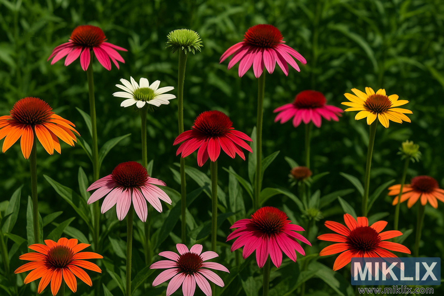 Dans l’ensemble, l’image est à la fois une vitrine botanique et une célébration esthétique. Elle transmet le charme et la résilience de l’échinacée, une plante chérie pour sa beauté, sa robustesse et sa valeur écologique. La diversité des formes et des couleurs, combinée à l’interaction douce de la lumière et du feuillage, crée une composition à la fois vibrante et sereine—un hommage à l’abondance de l’été et à l’élégance tranquille d’un jardin vivace en pleine floraison.