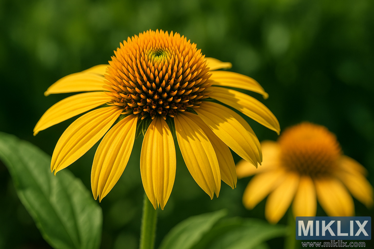 L’image présente un gros plan saisissant d’une échinacée de la Lune des Moissons (Échinacée) en pleine floraison estivale, capturant la chaleur radiante et l’élégance structurelle de cette variété hybride célèbre. Dominant le cadre, la fleur est baignée d’un soleil naturel éclatant, ses pétales jaune doré éclatants s’étendant en un cercle gracieux et légèrement tombant. Chaque pétale est allongé et lisse, avec de délicates nervures longitudinales qui captent la lumière et créent de subtiles variations de ton. Les pétales présentent une belle gamme de teintes dorées — allant d’un jaune riche et ensoleillé sur les bords à des tons plus profonds, presque couleur miel, près de leur base — contribuant à une sensation générale de chaleur et de vitalité.