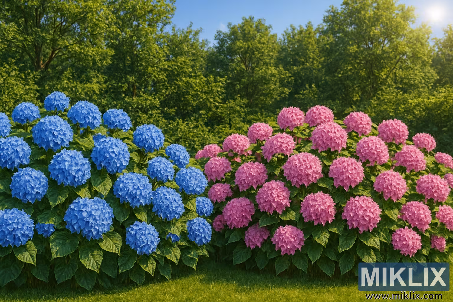 Une superbe bordure de jardin avec des hortensias bleus et roses en pleine floraison, brillant en plein soleil sur un feuillage vert et une pelouse soigneusement taillée.