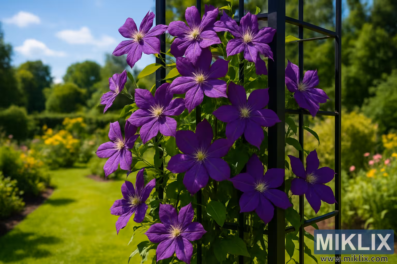 Un jardin d’été avec un treillis noir recouvert de fleurs de clématites violettes luxuriantes, sur une pelouse bien entretenue, des plates-bandes colorées et un ciel bleu avec des nuages.