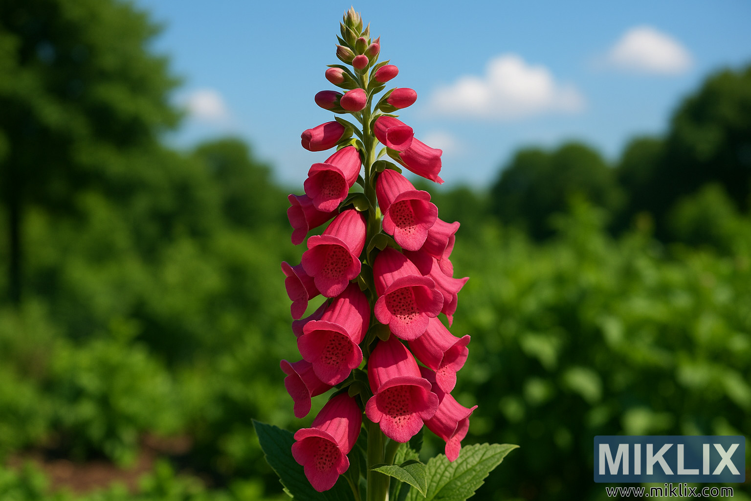 Les fleurs sont richement saturées d’une teinte chaude fraise-rose, une caractéristique caractéristique de cette variété hybride de digitale. Leur couleur s’approfondit subtilement vers la gorge, où un motif dense de taches cramoisies attire le regard vers l’intérieur et sert de guide naturel pour les pollinisateurs. Les pétales sont veloutés et légèrement translucides, captant la lumière du soleil d’une manière qui met en valeur leur texture douce et leurs détails fins. Chaque fleur s’épanouit délicatement sur le rebord, formant une forme de cloche qui se balance doucement avec la brise. Les fleurs sont densément tassées le long de la tige, créant une forme verticale luxuriante, presque architecturale, qui donne à la plante une présence imposante.