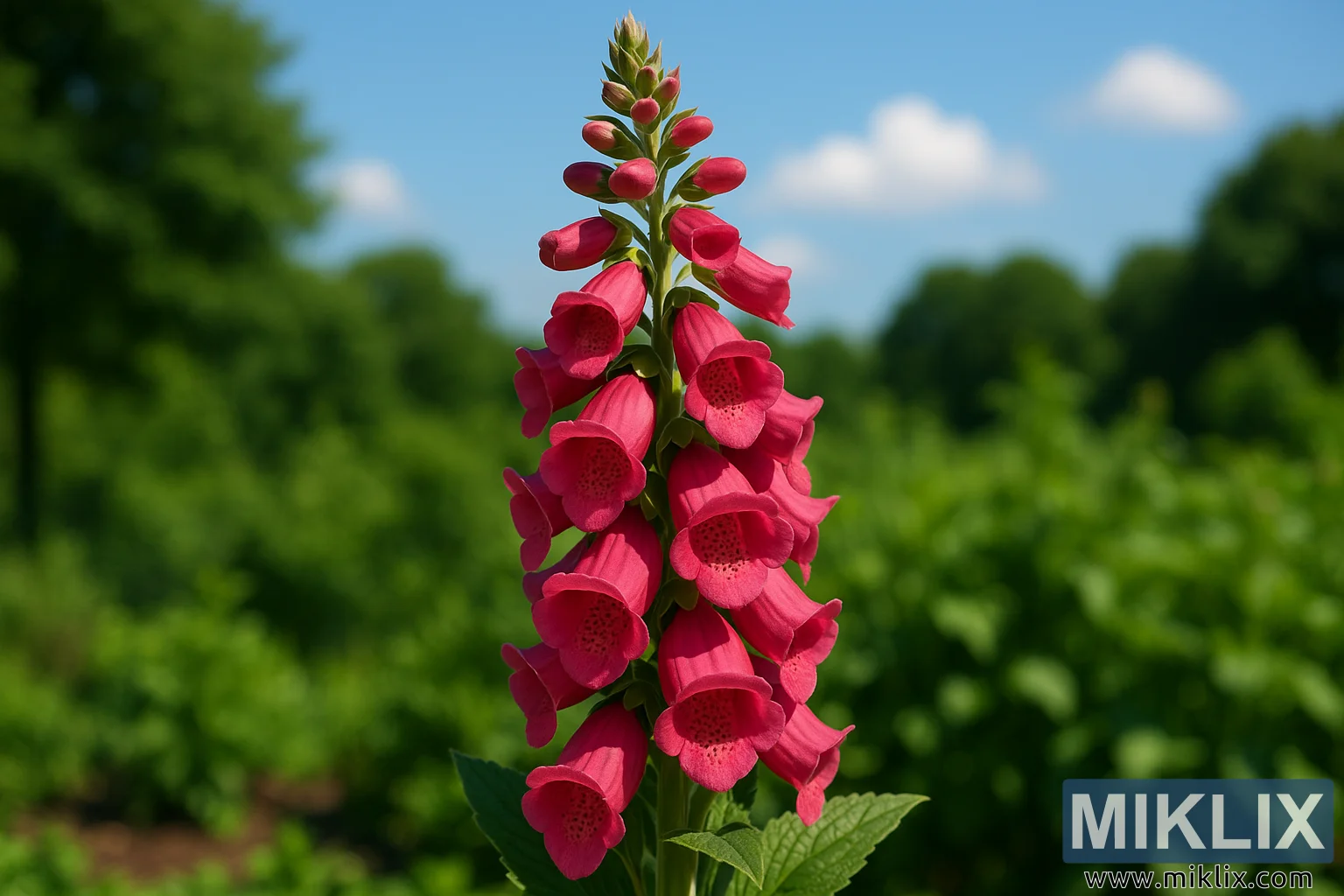 La digitale fraise est un membre particulièrement notable de la famille des digitalis, étant un hybride de Digitalis purpurea (digitale commune) et de Digitalis grandiflora (grande digitale jaune). Cette filiation lui confère des qualités exceptionnelles — une saison de floraison plus longue, une robustesse et une couleur florale distinctive qui combine les meilleures caractéristiques des deux espèces. Cette image capture magnifiquement toutes ces qualités : l’élégance de sa forme, la richesse de sa teinte et l’exubérance de sa floraison de la mi-été.