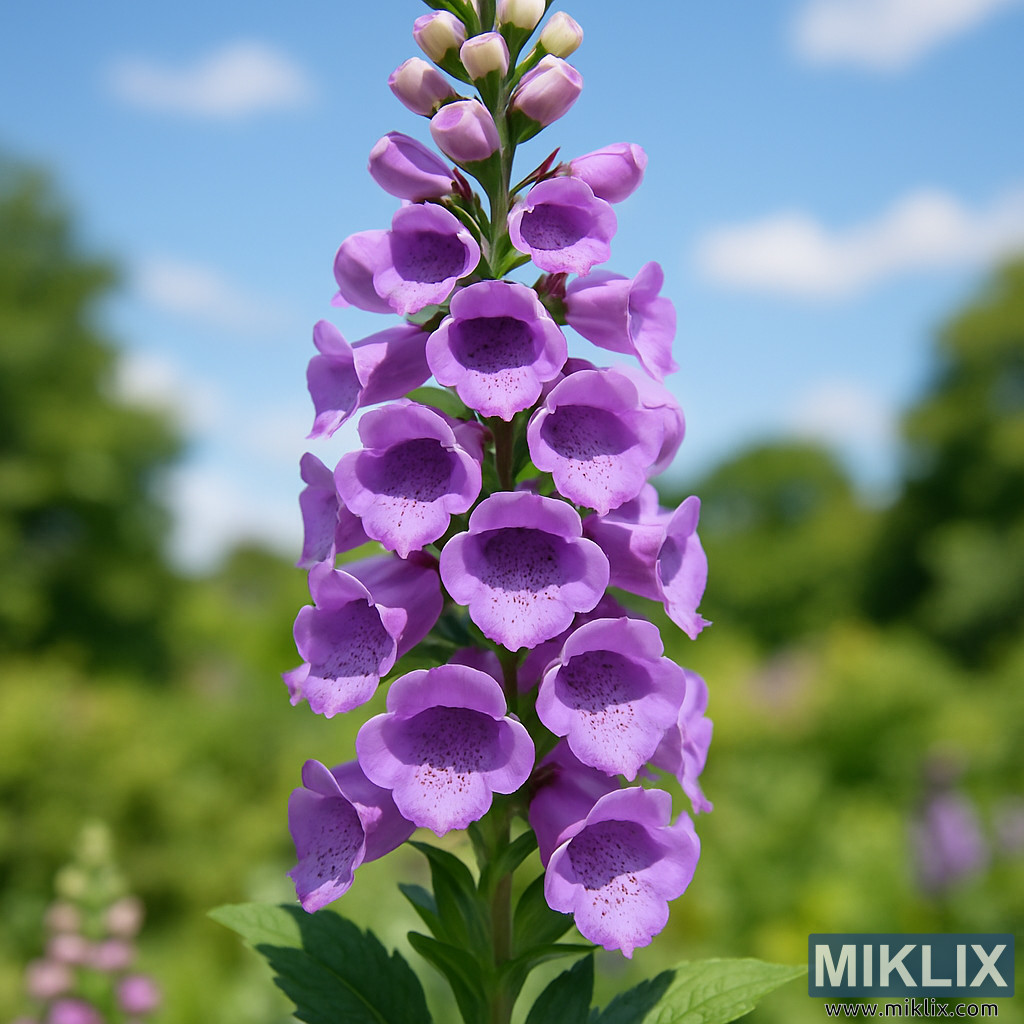L’environnement environnant améliore encore davantage la composition. En arrière-plan, un panorama flou de feuillage vert luxuriant, de textures douces de jardin et d’un ciel d’été éclatant parsemé de nuages blancs offre un contexte serein et naturel. L’effet bokeh doux garantit que l’attention reste fermement portée sur la digitale tout en transmettant l’impression d’un paysage de jardin florissant. L’éclairage est vif mais doux — caractéristique d’un midi ensoleillé en été — projetant des reflets délicats sur les pétales et mettant en valeur leurs contours sans éclipser leur couleur naturelle.