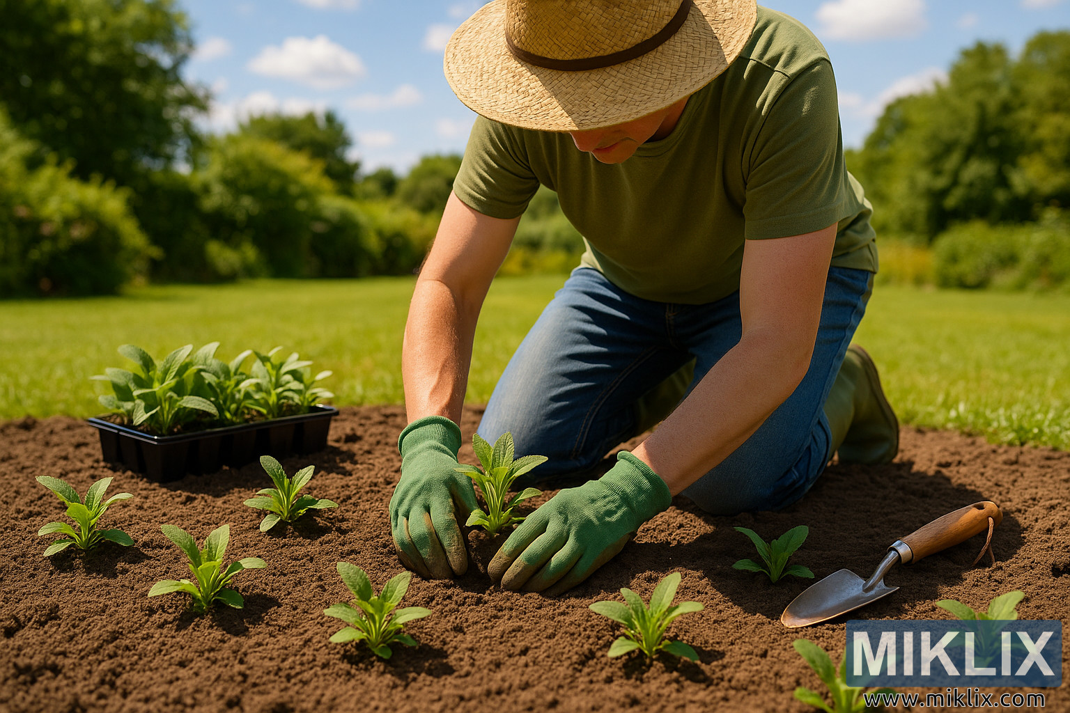 Autour du jardinier, une jolie disposition de semis attend d’être plantée. Certains ont déjà été installés dans le sol, leur feuillage vibrant contrastant magnifiquement avec la terre sombre et finement texturée. D’autres restent dans un petit plateau noir à proximité, prêts à être transplantés. Une truelle à main repose au sol à côté du jardinier, sa lame saupoudrée de terre — un détail subtil qui souligne l’authenticité et l’activité de la scène. Le sol lui-même semble bien préparé, meuble et riche en nutriments, ce qui suggère une planification et une culture minutieuses avant la plantation.