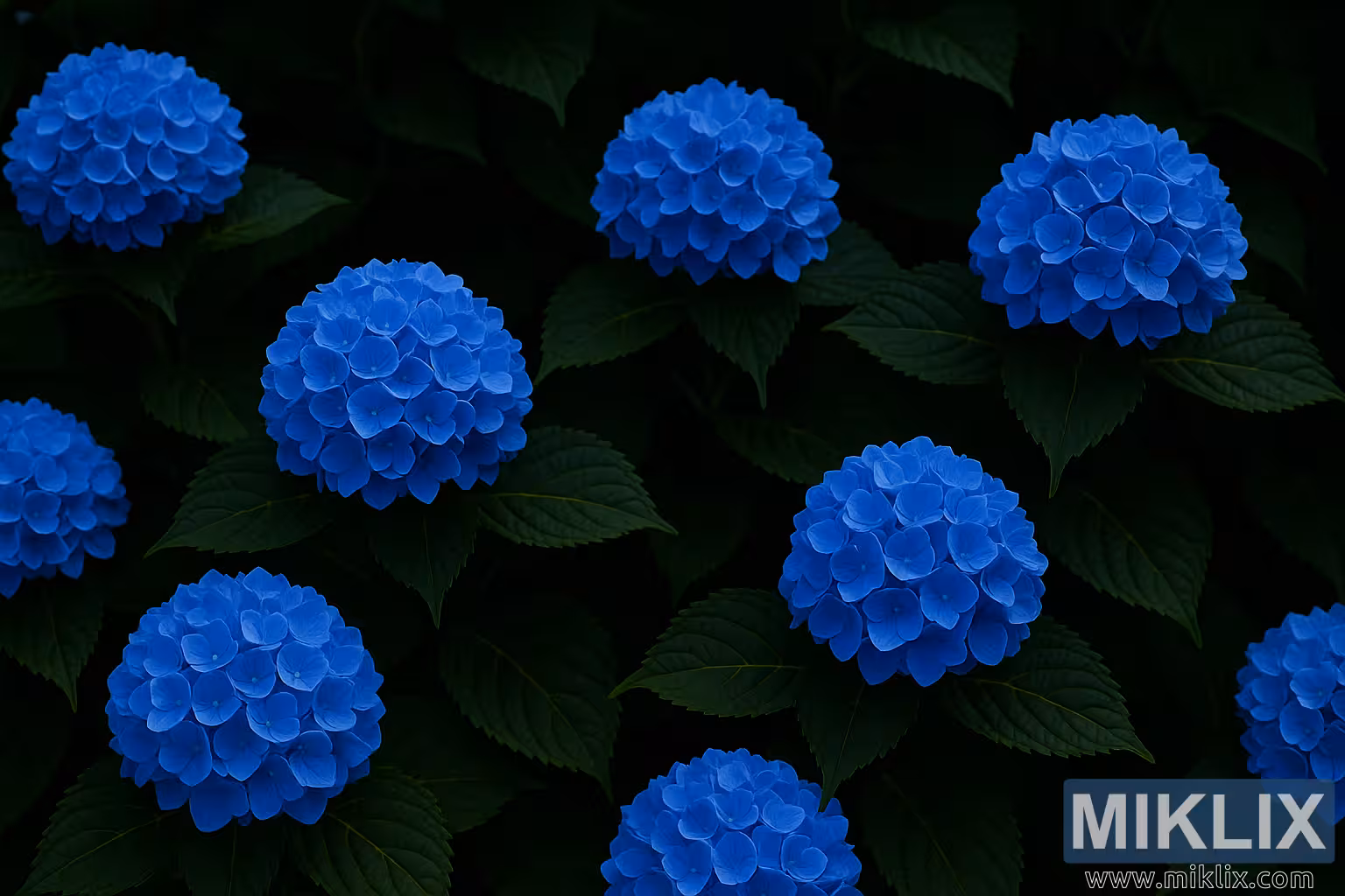 Dans l’ensemble, la scène résume l’essence de l’hortensia Nikko Blue : des fleurs audacieuses et intensément colorées, sur un fond vert foncé dramatique. L’image transmet non seulement l’impact visuel de la plante, mais aussi sa présence dans le jardin — luxuriante, imposante et d’une beauté naturelle. Cela évoque la sensation de se tenir devant un hortensia florissant en plein été, où couleur, forme et texture convergent pour créer une démonstration intemporelle d’art botanique.