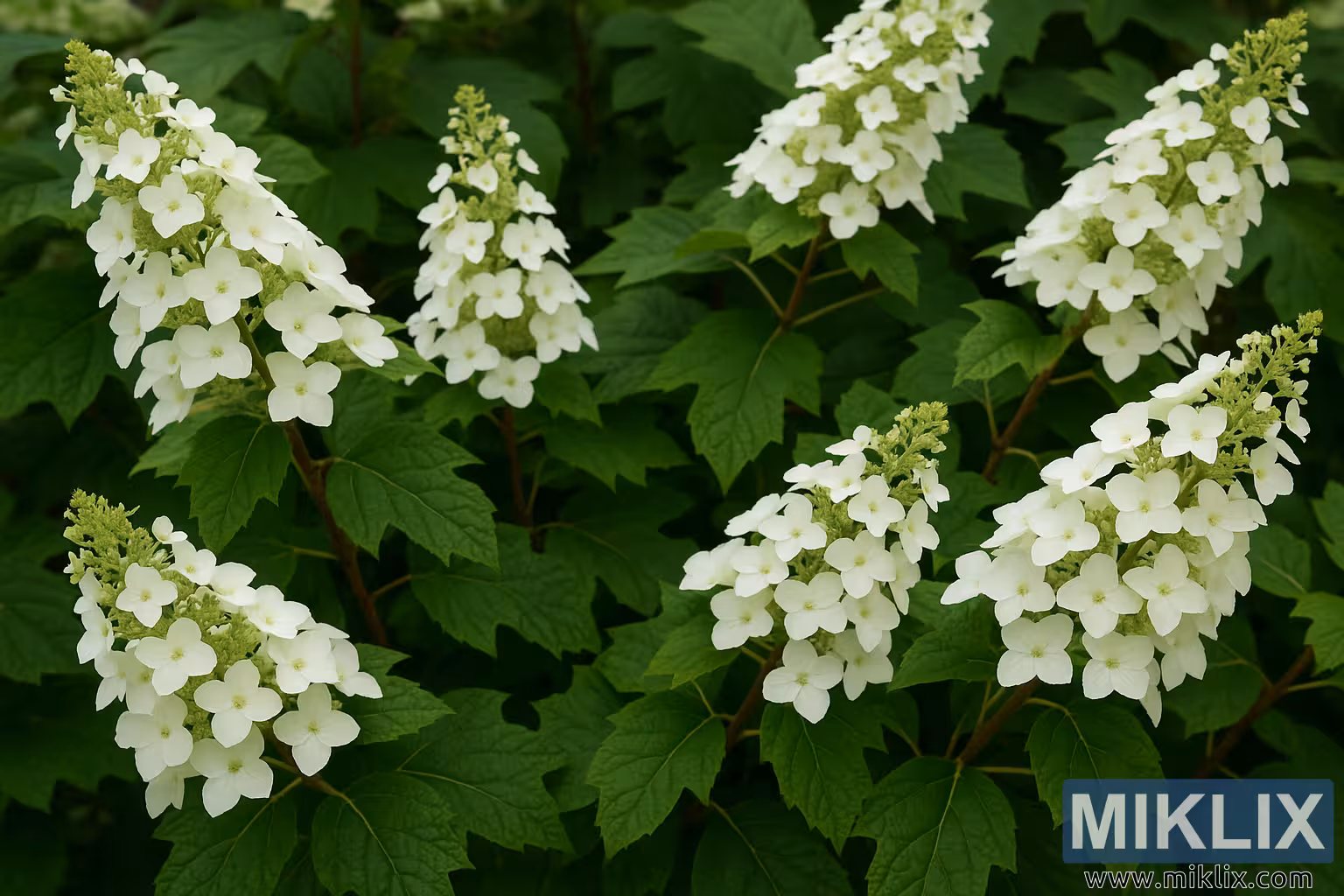L’image capture magnifiquement l’hortensia à feuilles de chêne de la Reine des neiges (Hydrangea quercifolia « Reine des neiges ») en pleine floraison, mettant en valeur son mélange distinctif d’élégance et de feuillage architectural. La caractéristique la plus frappante est la panicule allongée en forme de cône de fleurs qui dominent la composition. Chaque panicule est densément remplie de dizaines de fleurons à quatre pétales, leur forme nette et délicate, disposées en couches qui s’effilent gracieusement jusqu’à une pointe. Les fleurs passent d’un blanc verdâtre doux à la base à un blanc lumineux pur aux extrémités, créant un dégradé subtil qui ajoute à la fois profondeur et fraîcheur à l’écran. Leur forme allongée et en cascade les distingue des têtes arrondies des autres hortensias, apportant un sentiment de mouvement et de verticalité à l’arbuste.