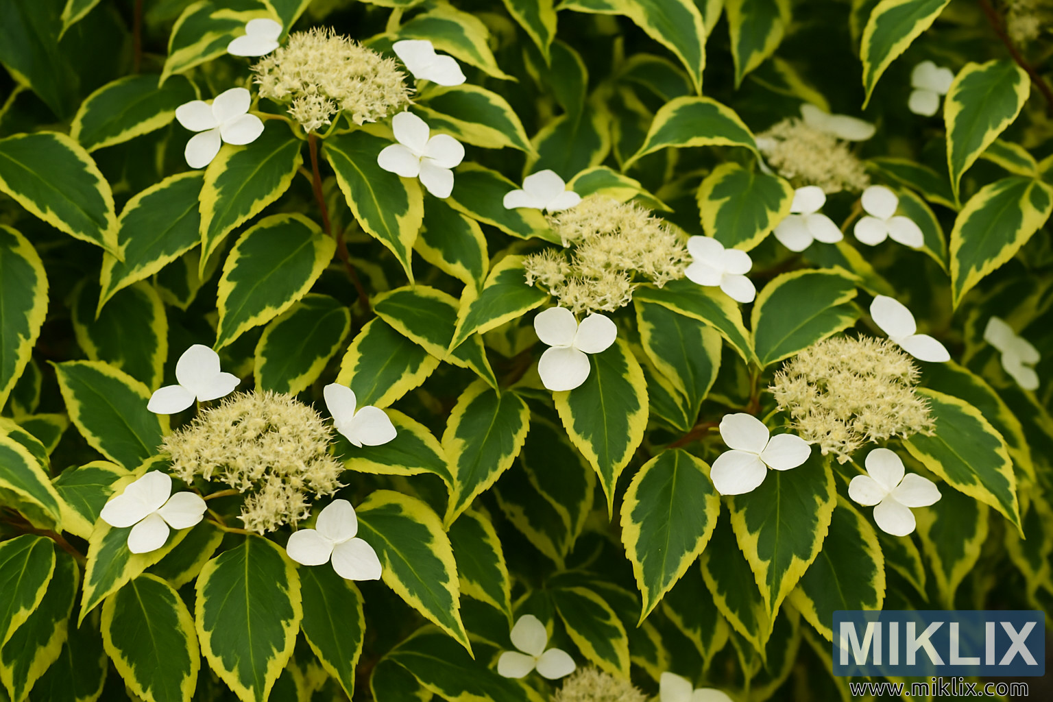 Parmi les feuilles, on trouve les fleurs emblématiques de la plante. Chaque grappe florale est composée d’un disque plat de minuscules fleurons fertiles, d’un blanc crème au centre, entouré d’un halo de grandes fleurons stériles avec quatre pétales blancs immaculés. Ces fleurons externes, largement espacés, ressemblent à des étoiles flottant délicatement au-dessus des feuilles, tandis que les fleurons centraux ajoutent une texture fine semblable à une broderie en dentelle. Le contraste entre les fleurs d’un blanc éclatant et le feuillage panaché éclatant accentue leur proéminence, les rendant lumineuses sur le centre vert foncé des feuilles.