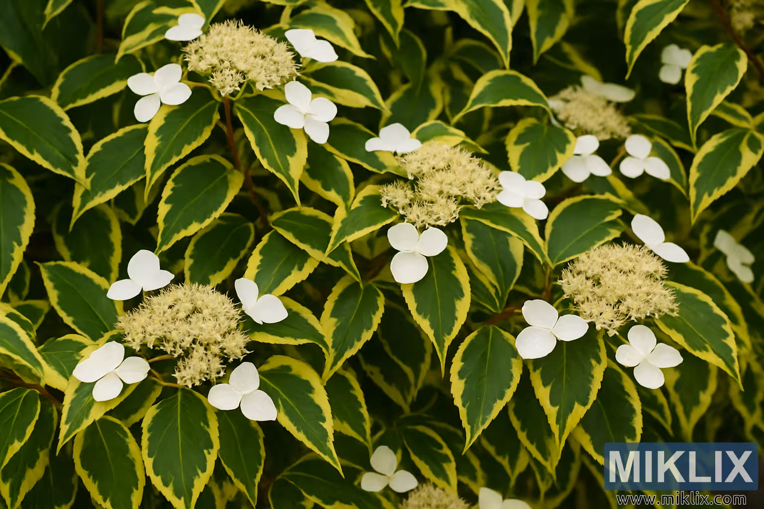 Hortensia grimpant Miranda avec un feuillage panaché saisissant bordé de jaune et de délicates fleurs blanches en dentelle qui brillent sous la douce lumière estivale.
