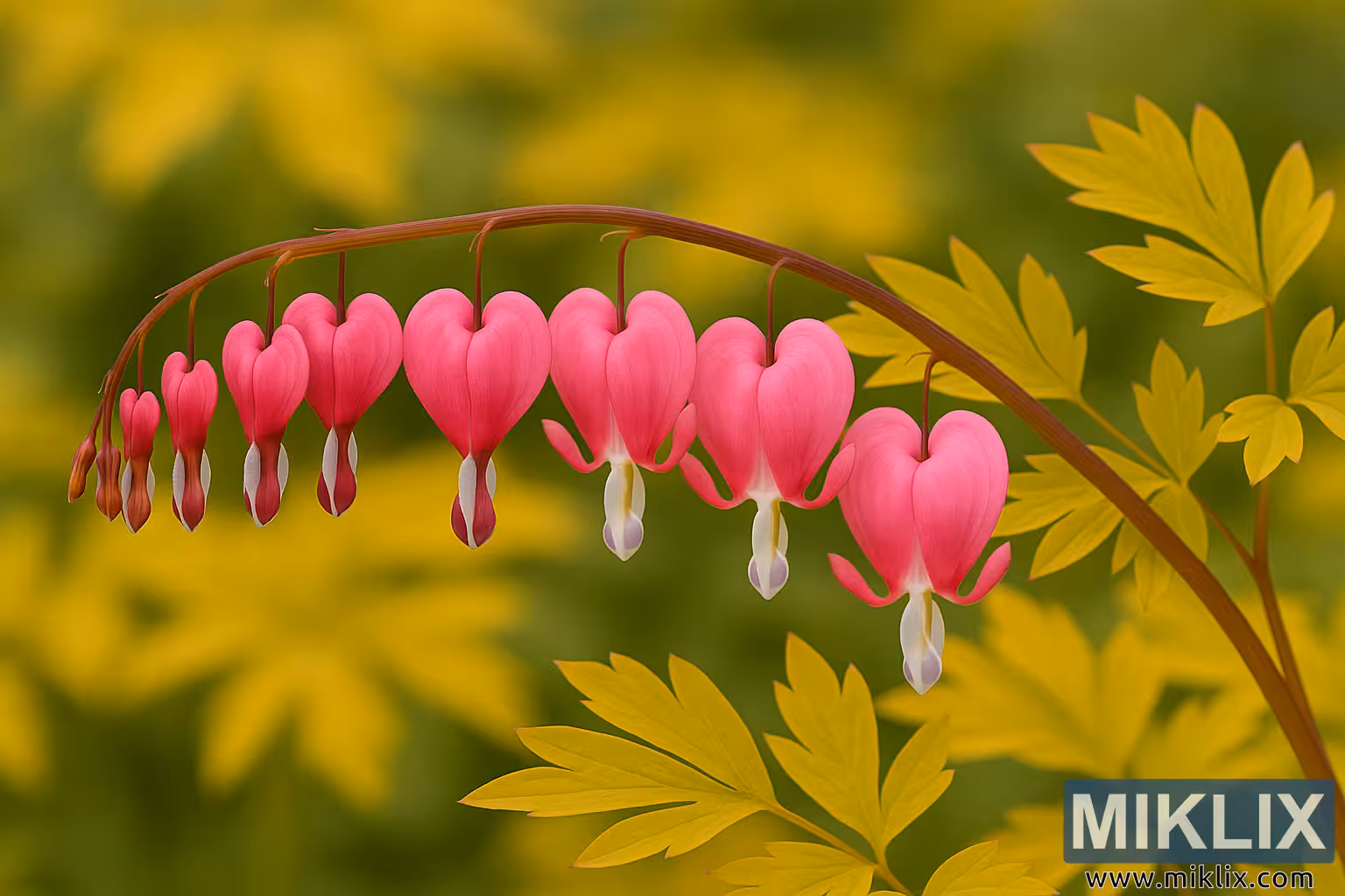 Cette photographie haute résolution capture le charme radieux du Dicentra spectabilis « Cœur d’Or », communément appelé le Cœur Saignant du Cœur d’Or. L’image présente une composition botanique parfaitement équilibrée mettant en scène une tige brun-rougeâtre gracieusement arquée, d’où pend une série de fleurs roses vibrantes en forme de cœur, formant une courbe douce. Chaque fleur présente la forme classique qui rend la plante au cœur saignant si iconique — des pétales extérieurs roses arrondis qui se rejoignent en une fente douce au sommet et s’ouvrent en dessous pour révéler un délicat pétale intérieur blanc pur qui s’étend vers le bas comme une seule goutte de perle. Les fleurs sont disposées rythmiquement le long de l’arche, leur symétrie pendante rehaussée par l’interaction des couleurs et de la lumière.