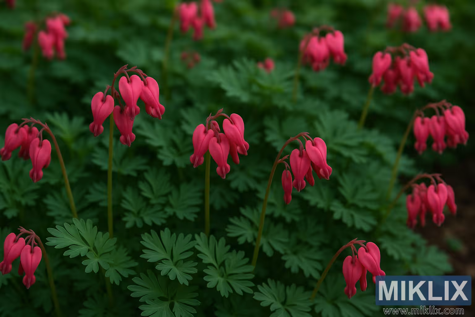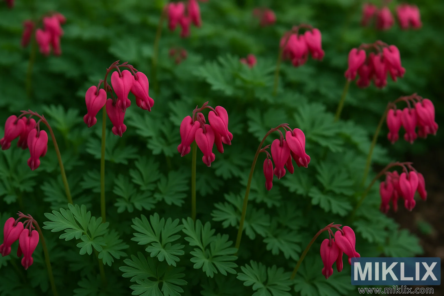 Cette photographie de paysage haute résolution représente le Roi des Cœurs Sensible (Dicentra « Roi des Cœurs ») dans toute sa splendeur florale, capturant une vue luxuriante et détaillée de cette vivace adorée. La scène présente des grappes de fleurs en forme de cœur, d’un rose profond, suspendues gracieusement à des tiges fines et arquées qui s’élèvent élégamment au-dessus d’un lit dense de feuillage vert doux, semblable à des fougères. Chaque fleur est une petite merveille de design naturel : les deux pétales extérieurs s’incurvent vers l’extérieur pour former la forme emblématique en cœur, s’effilant en un point délicat au bas, tandis que les pétales intérieurs restent nichés à l’intérieur comme une fleur secrète.