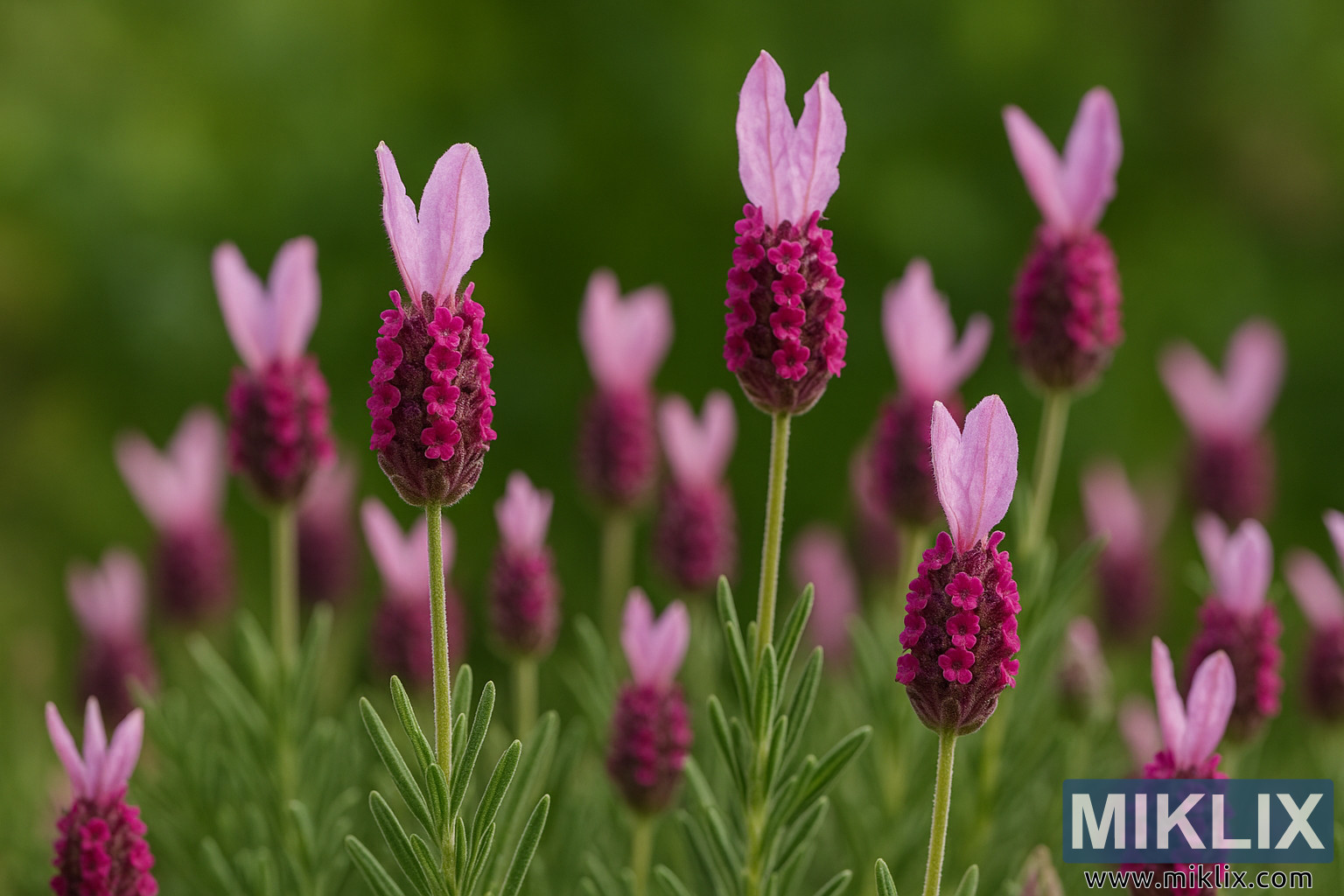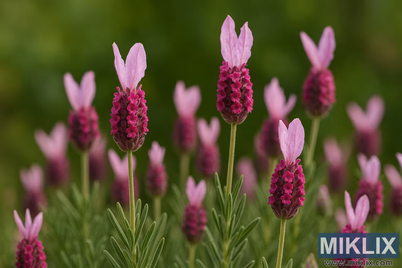 Cette photographie rapprochée capture la beauté exquise de Lavandula stoechas « Kew Red », un cultivar distinctif et accrocheur de lavande espagnole, célèbre pour ses épines florales richement colorées et ses délicates bractées semblables à des pétales. Baignée d’une douce lumière naturelle, la composition présente la plante à son plus saisissant — vibrante, complexe sur le plan texturé et débordante de couleurs — sur un fond de feuillage vert flou qui accentue l’impact visuel dramatique des fleurs.