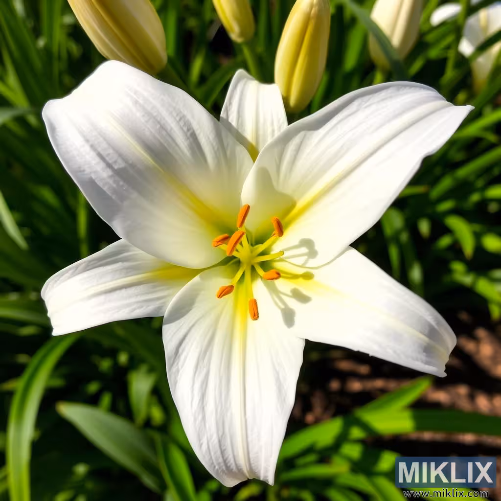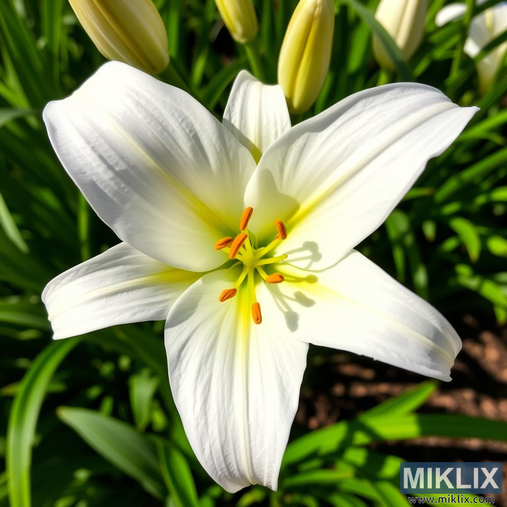 Le lys blanc capturé dans cette image dégage une élégance intemporelle, sa floraison incarnant parfaitement la pureté et la sérénité. Chaque pétale est lisse et sans défaut, se déployant avec des courbes douces qui créent une forme équilibrée d’étoile. La surface blanche immaculée capte la lumière du soleil avec une douce brillance, donnant à la fleur une qualité presque lumineuse, comme si elle brillait naturellement de l’intérieur. Cette radiance souligne le rôle du lys comme symbole de paix et de renouveau, attirant l’attention sur sa présence discrète mais puissante dans le jardin. Les pétales ne sont pas d’un blanc éclatant, mais sont subtilement rehaussés par des veines délicates et des textures légères qui témoignent de leur fragilité et de leur grâce naturelle. Leurs bords s’arquent légèrement, créant une forme ouverte et accueillante qui semble inviter l’observateur à s’approcher.
