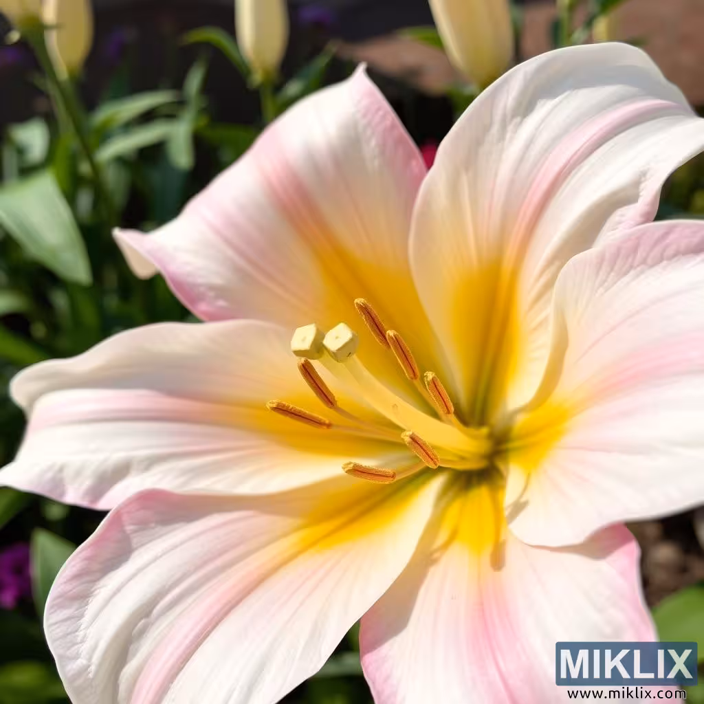 Ce lys, en pleine floraison sous la douce caresse du soleil, dégage une élégance presque éthérée. Ses pétales sont larges et délicatement courbés, s’ouvrant vers l’extérieur dans une mise en scène gracieuse qui révèle à la fois force et fragilité. Leur base est baignée d’une lueur dorée et chaleureuse qui se répand comme la lumière du soleil se levant à l’aube, s’estompant peu à peu en un blanc pur et crème vers les extrémités. Sur les bords, de légers blush rose pastel ajoutent une douce touche romantique de couleur, conférant à la fleur une aura de tendresse et de raffinement. Le mélange subtil des nuances semble peint par la nature avec les coups de pinceau les plus délicats, donnant à la fleur l’impression d’avoir été façonnée à partir de la lumière elle-même.