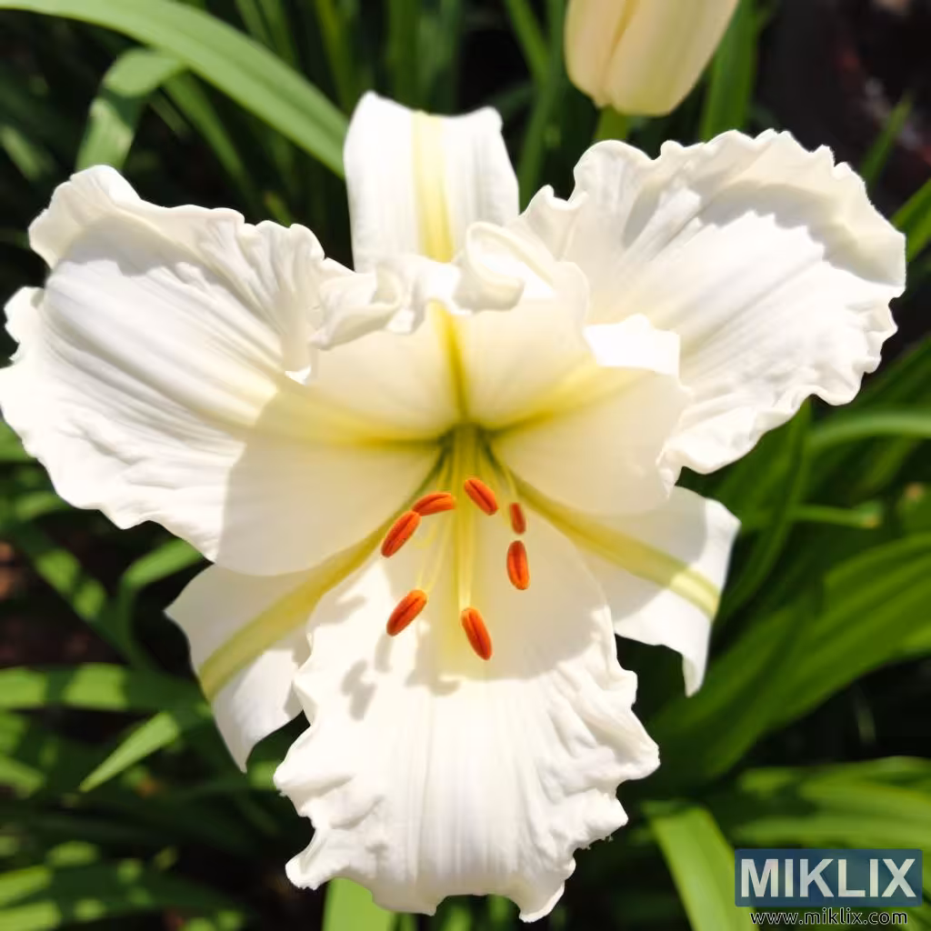 Ce lys blanc fleurit comme une vision d’élégance sculptée dans la lumière, attirant l’attention par sa forme grandiose et sa lueur éthérée. Les pétales sont larges et d’une texture luxueusement douce, leur blancheur immaculée rappelant la neige fraîche caressée par le soleil du matin. Contrairement aux courbes simples et lisses de nombreuses fleurs, ces pétales présentent un volant exquis le long de leurs bords, chaque ondulation et pli conférant à la fleur une aura de sophistication et de complexité. C’est comme si la fleur avait été ornée d’une délicate dentelle, les contours frangés amplifiant sa grâce naturelle et attirant le regard dans chaque détail de sa structure. Le jeu du soleil sur les pétales met en valeur leur douce brillance, les faisant scintiller faiblement comme s’ils portaient en eux une radiance tranquille.