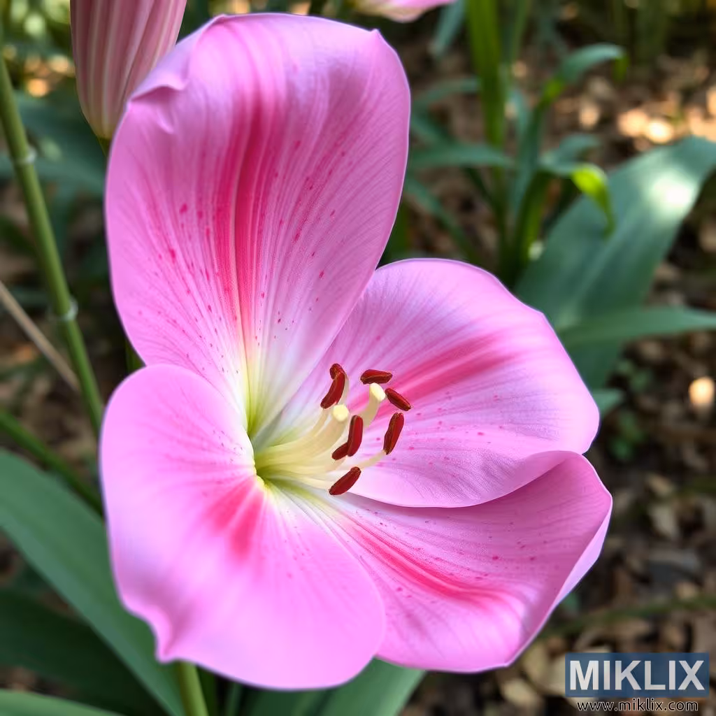 Autour du lys, le contexte de feuilles vertes offre un décor serein. Longs, en forme de lance et vibrants, ils s’étendent vers l’extérieur en lignes nettes, offrant un contraste tant dans la couleur que dans la texture. Leur simplicité encadre les détails complexes de la fleur, permettant au rose de briller avec encore plus d’intensité. En arrière-plan, adouci par la profondeur de champ, le cadre naturel du jardin apporte des tons atténués et des formes floues, renforçant le sentiment de tranquillité. Les tons terreux du sol et le jeu épars de lumière et d’ombre ancrent la scène dans un naturel tranquille, gardant la fleur au centre de l’attention.