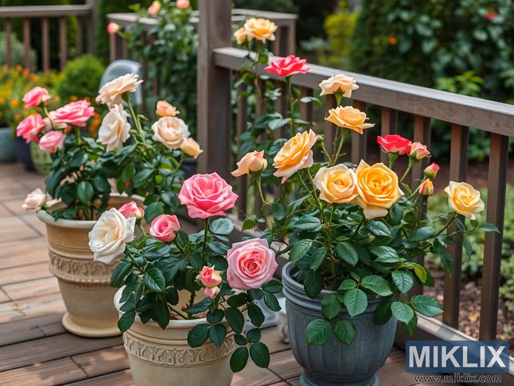 Dans l’ensemble, cette image transmet plus que la beauté des roses en pot; Il évoque l’essence d’une retraite extérieure paisible et bien entretenue. La combinaison de fleurs éclatantes, de verdure luxuriante et de la terrasse en bois chaleureuse crée un cadre accueillant, serein et profondément lié aux rythmes de la nature. C’est un portrait de la façon dont de simples gestes de cultivation—arranger les pots, soigner les plantes et en prendre soin—peuvent transformer un espace ordinaire en un sanctuaire de couleur, de parfum et de vie. Les roses en pot sont non seulement des symboles de beauté, mais aussi des reflets de la joie et de la tranquillité que le jardinage apporte à la vie quotidienne.