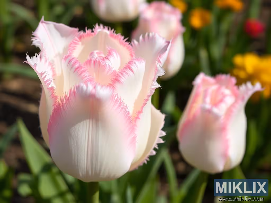 Une tulipe blanche aux pétales frangés rose tendre brille au soleil, entourée de fleurs colorées floues dans un jardin printanier animé.