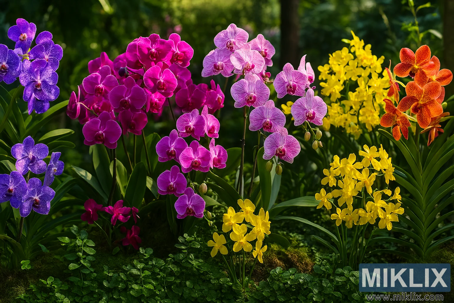 Explorez un jardin d’été vibrant rempli de variétés d’orchidées colorées, dont Vanda, Phalaenopsis et Oncidium, baigné d’un soleil chaud et entouré d’une végétation luxuriante.