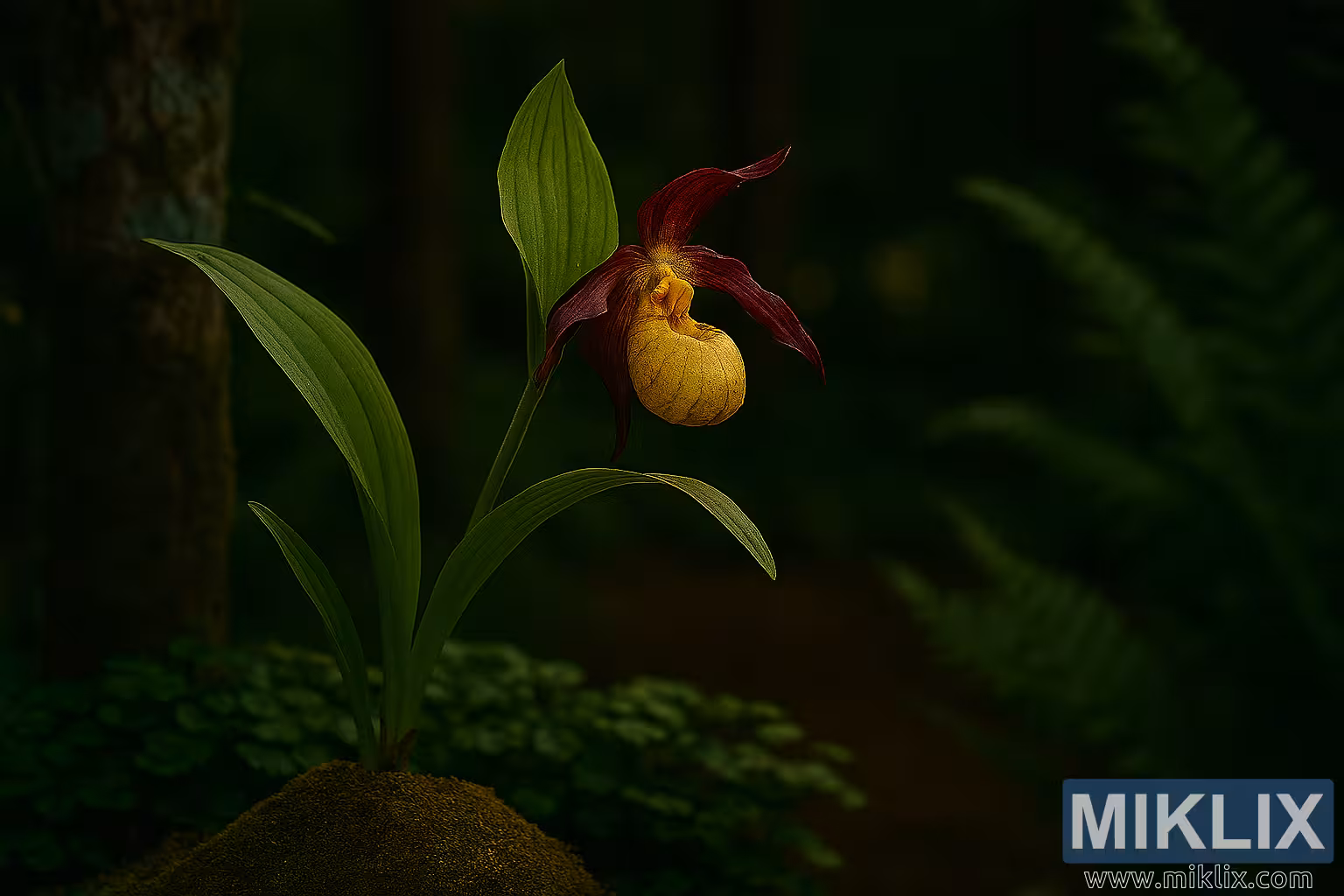 L’éclairage est doux et naturel, avec une illumination délicate qui met en valeur les textures de l’orchidée et projette des ombres subtiles qui renforcent sa forme tridimensionnelle. La palette de couleurs est un mélange harmonieux de jaunes chauds, de bordeaux profonds, de verts vibrants et de bruns terreux, évoquant la beauté tranquille d’un jardin boisé ombragé.