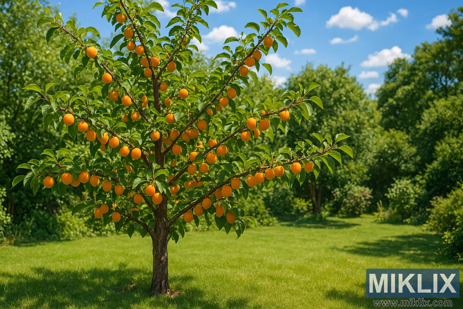 Un jardin d’été ensoleillé avec un abricotier mature chargé de fruits orangé doré, entouré d’une herbe vibrante et d’une verdure luxuriante sous un ciel bleu clair.