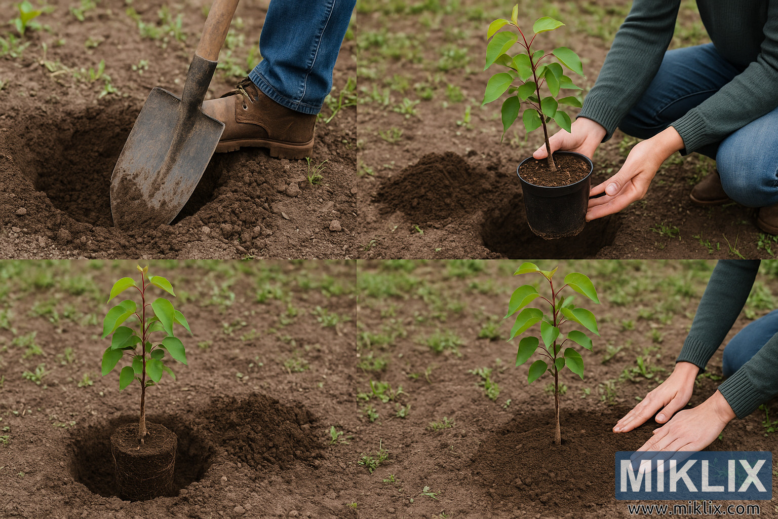 Cette image orientée paysage présente un collage photographique détaillé en quatre panneaux illustrant le processus séquentiel de plantation d’un jeune abricotier dans un jardin extérieur. Les cases sont disposées de façon naturelle de gauche à droite, de haut en bas, formant un récit visuel cohérent qui capture le rythme et la simplicité de cette activité horticole.
