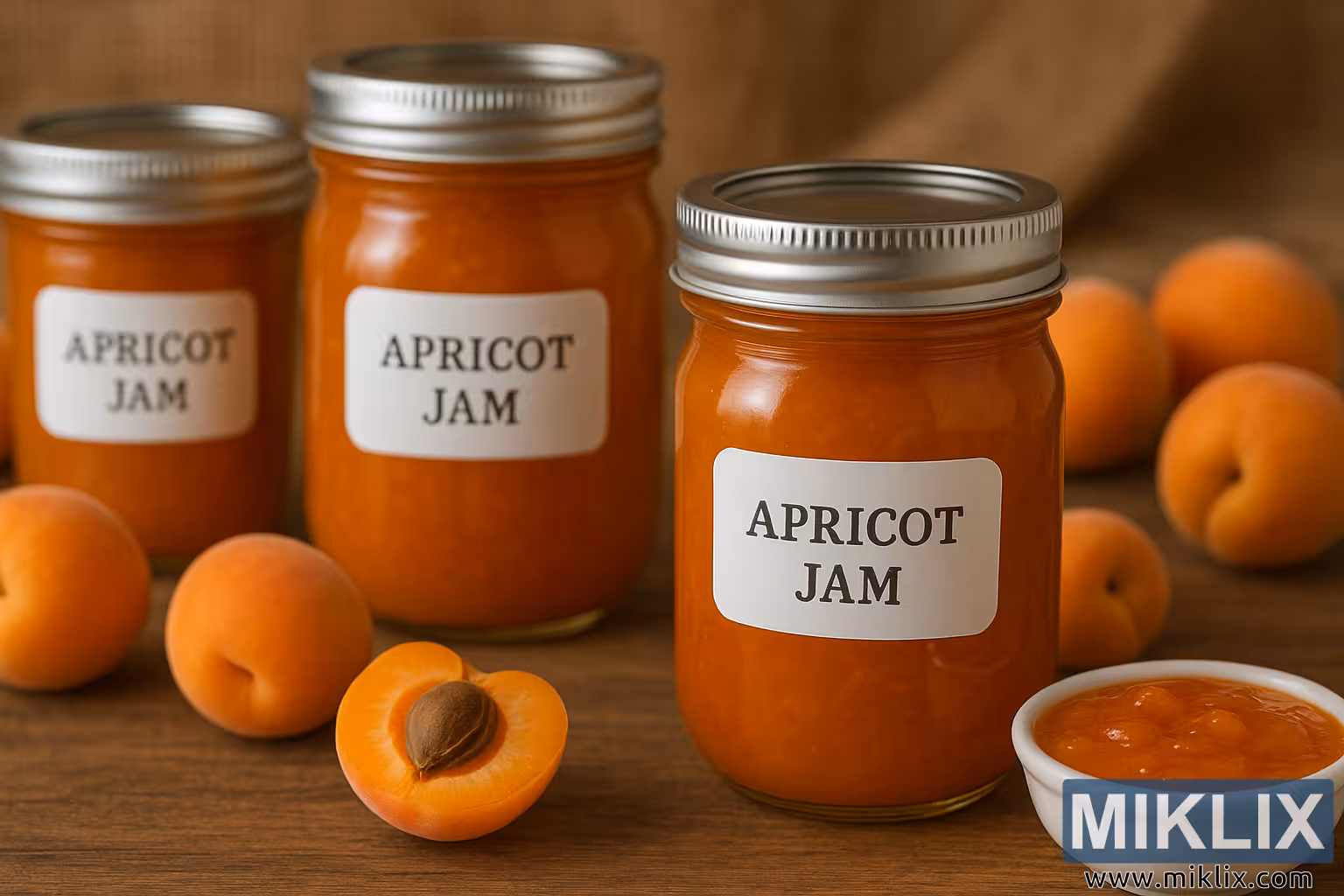 Une photo chaleureuse et rustique de confiture d’abricots maison dans des bocaux en verre portant l’étiquette « Confiture d’abricots », exposée avec des abricots frais et un plat de confiture sur une surface en bois.