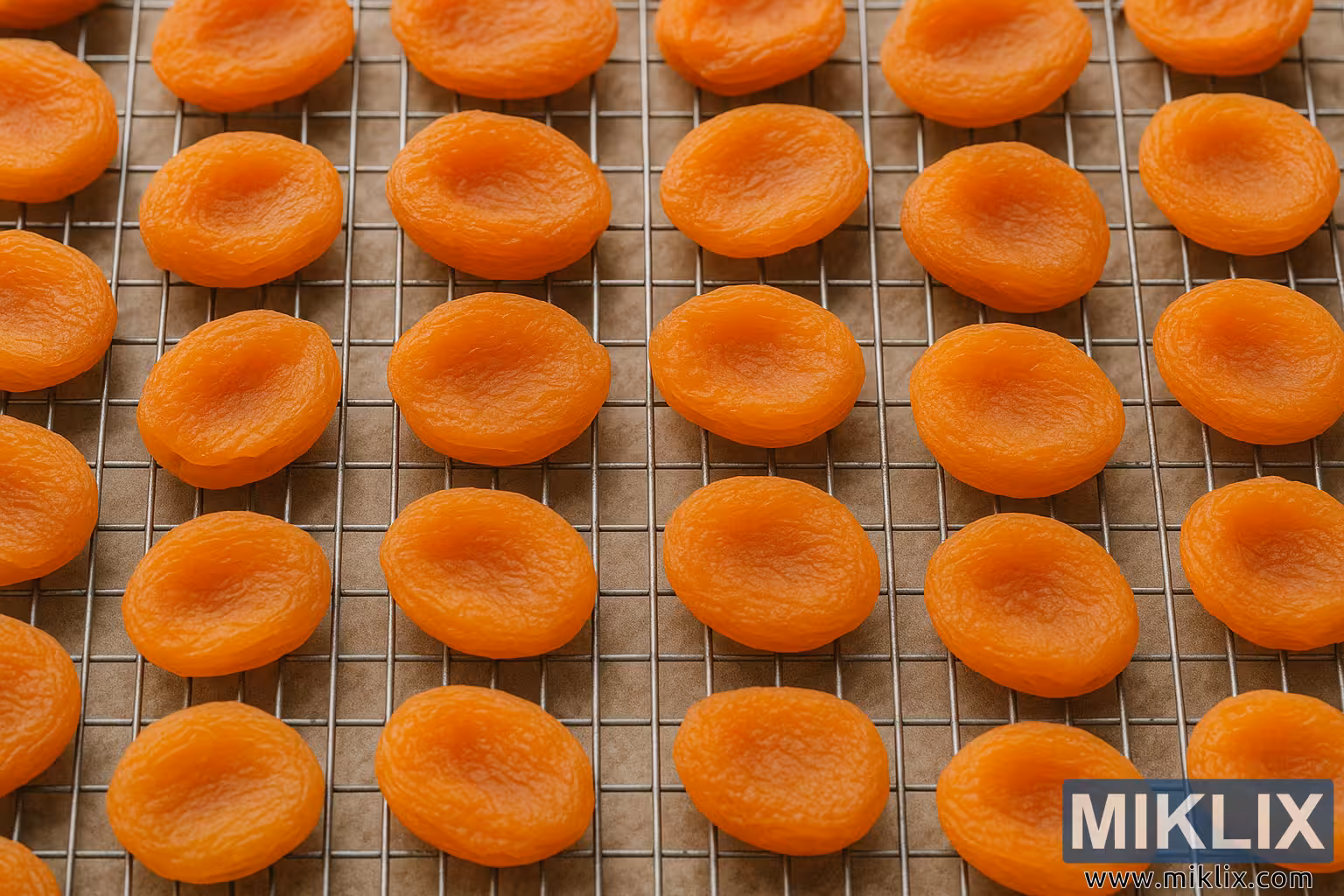 Une photo haute résolution montrant des rangées de tranches d’abricot séché orange doré disposées sur un séchoir en fil métallique, mettant en valeur leurs textures froissées et leur couleur naturelle sous un éclairage doux.