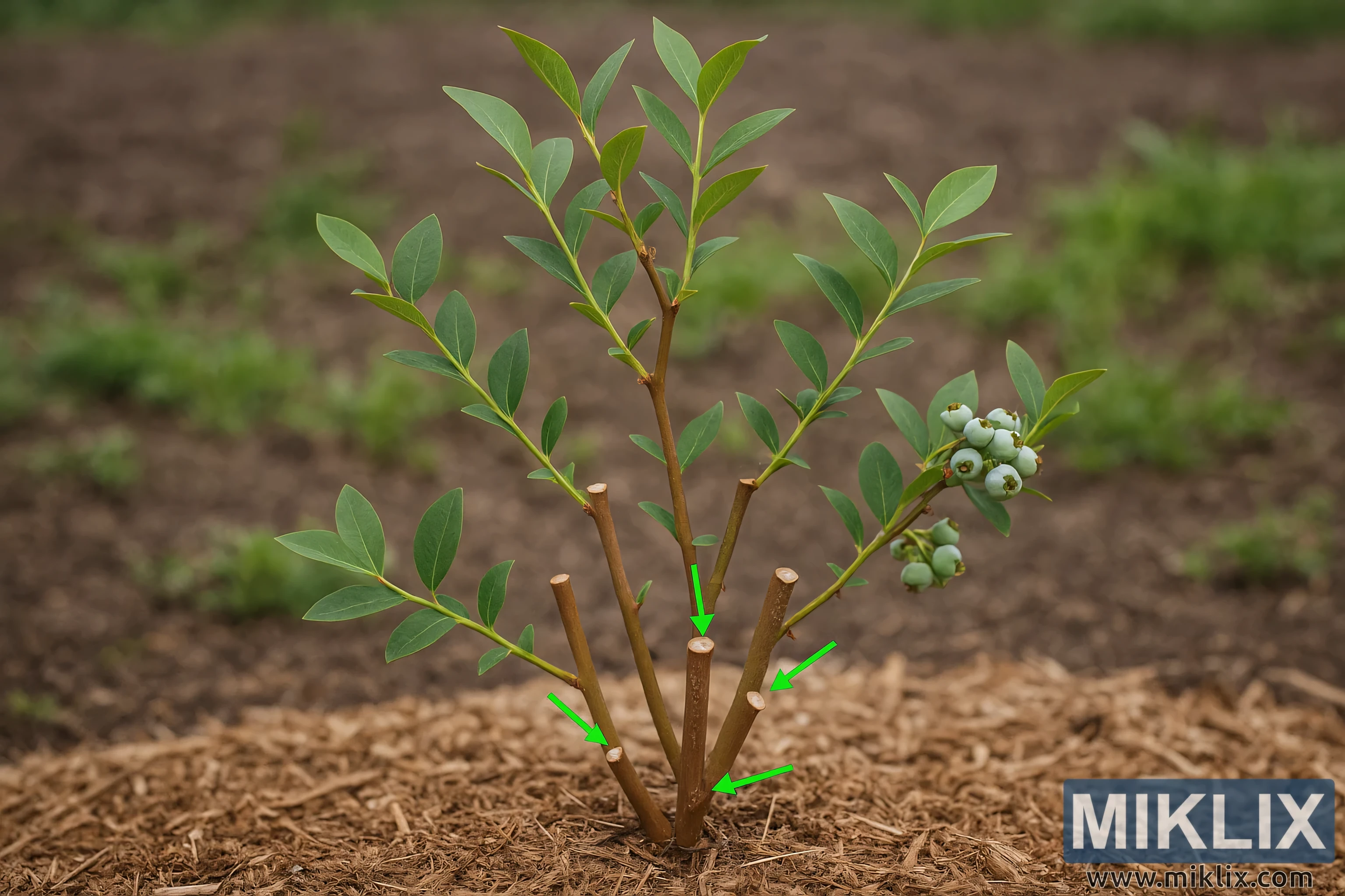 Au centre de l’image, le buisson de bleuets se dresse avec cinq tiges principales sortant de la base. Chaque tige est lisse et brun rougeâtre, indiquant une jeune plante saine et vigoureuse. Les parties inférieures des tiges ont été taillées pour façonner le buisson et favoriser la croissance ouverte. Les coupes de taille fraîches sont propres, circulaires et soigneusement faites juste au-dessus de la base de la plante. Chacune de ces coupes est mise en évidence par des flèches vertes vives, indiquant clairement les endroits où la taille a eu lieu. Ces flèches ont un but pédagogique, guidant l’attention du spectateur vers la bonne technique pour une taille précoce — enlever les tiges faibles ou à faible croissance pour favoriser un cadre équilibré.