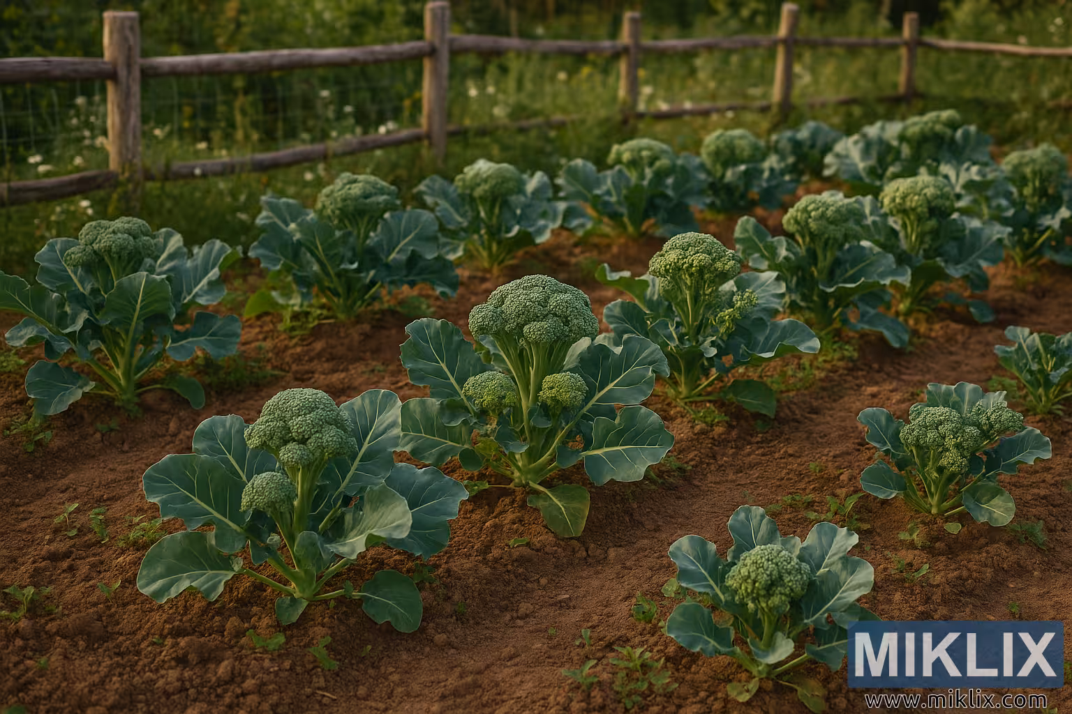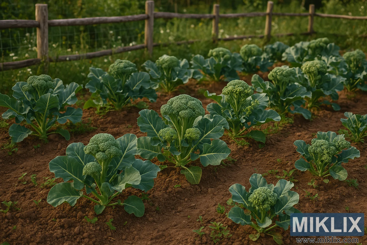 Les plates-bandes sont soigneusement disposées en rangées parallèles, alignées pour un espacement efficace et une circulation d’air, ce qui est essentiel à la croissance du brocoli et à la prévention des nuisibles. Le brun terreux du sol contraste vivement avec les verts profonds du feuillage, créant une palette harmonieuse qui évoque fraîcheur et vitalité. Le jardin est entouré d’une clôture rustique en bois faite de poteaux et de rampes usés, avec un treillis métallique entre eux. Au-delà de la clôture, un décor luxuriant d’herbes sauvages, de mauvaises herbes en fleurs et de feuillages verts doux crée un cadre naturel, donnant l’impression d’un cadre de ferme à la campagne.