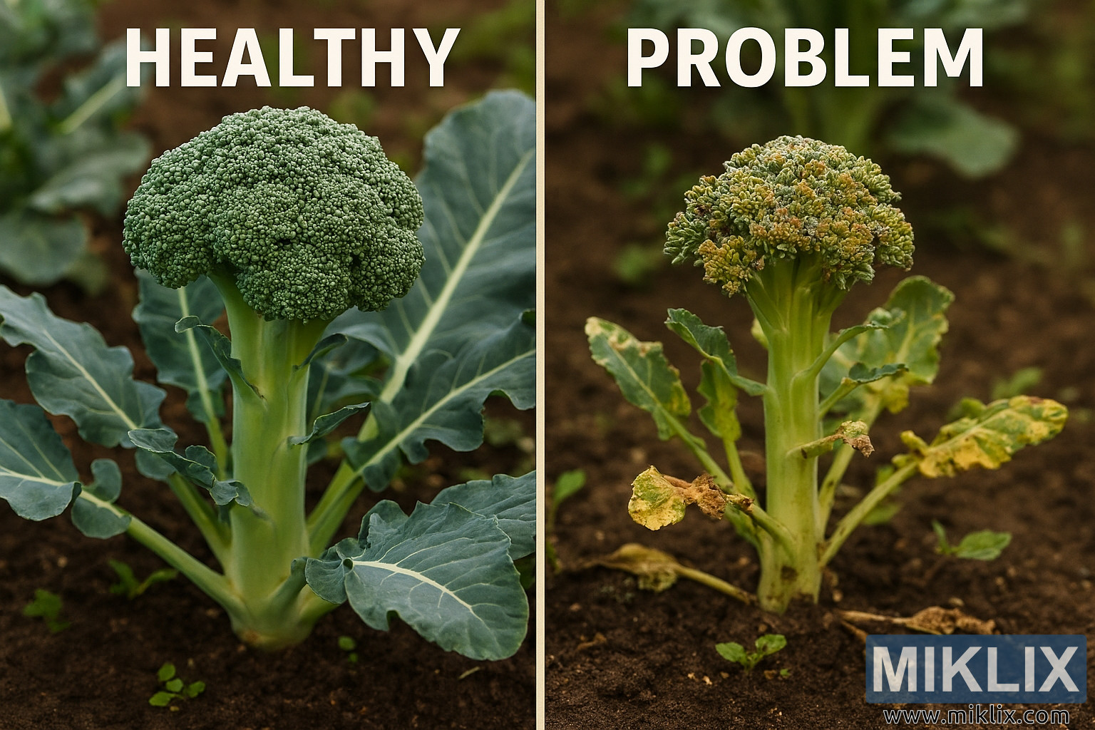 Sur le côté droit de l’image, le brocoli étiqueté comme ayant des problèmes raconte une toute autre histoire. Sa tête est nettement plus petite, moins compacte et de couleur inégale. Les florets sont espacés de façon irrégulière, avec des taches jaunies et quelques zones brunes et desséchées qui indiquent un stress ou une maladie. La tige est plus fine, plus pâle et teintée d’une teinte jaunâtre, suggérant une faiblesse ou une carence en nutriments. Les feuilles sont plus petites et moins abondantes, beaucoup montrant des signes de détresse : jauniment, brunissement, bords recourbés et, dans certains cas, des dommages visibles causés par des nuisibles ou des stress environnementaux. Certaines feuilles semblent fanées ou partiellement mangées, ce qui souligne encore davantage la santé affaiblie de la plante. Le sol sous cette plante, bien que similaire en texture et couleur à celui de la plante saine, contient plus de débris et de petites mauvaises herbes, ce qui suggère un soin moins attentif ou une compétition pour les nutriments. L’arrière-plan reste légèrement flou, mais le contraste entre les deux plantes au premier plan est frappant et indéniable.