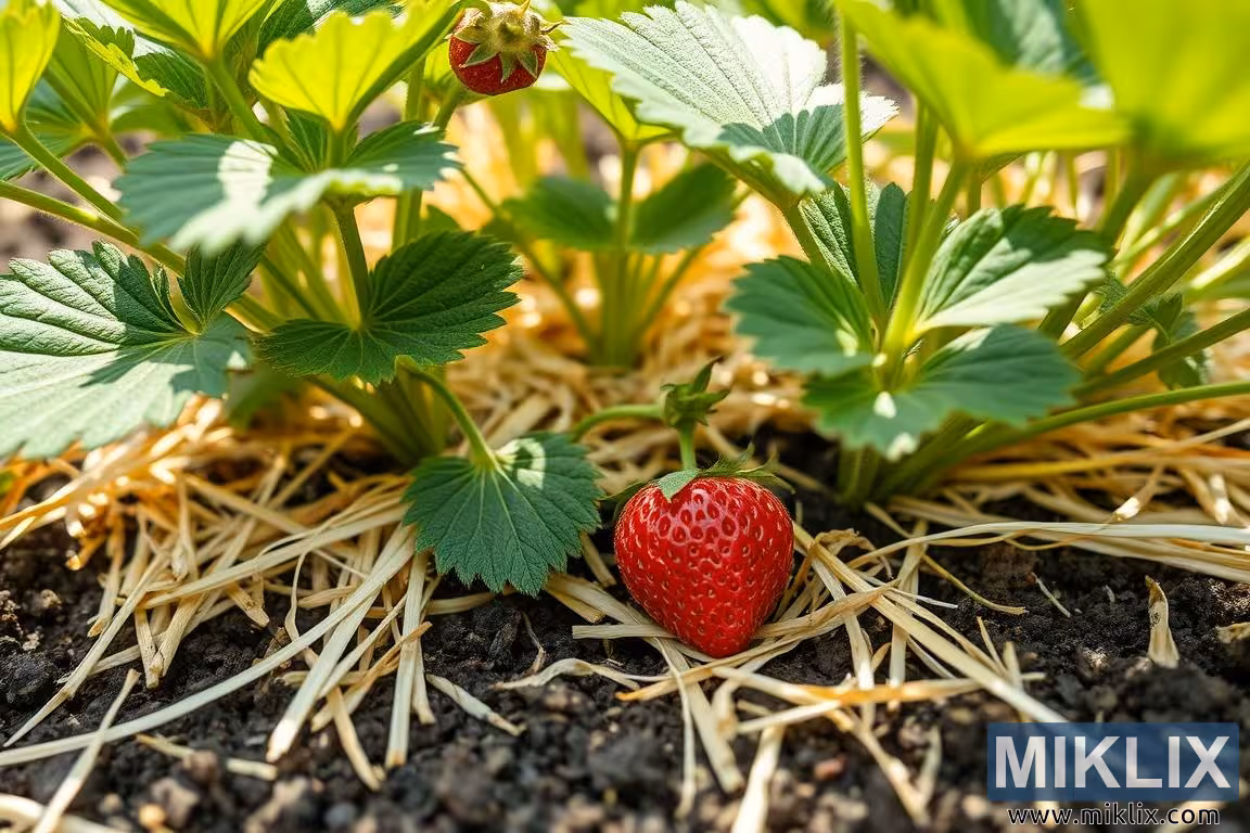 Une fraise rouge vif repose sur du paillis de paille parmi des feuilles vertes luxuriantes, mettant en valeur une culture saine et bien entretenue du jardin.