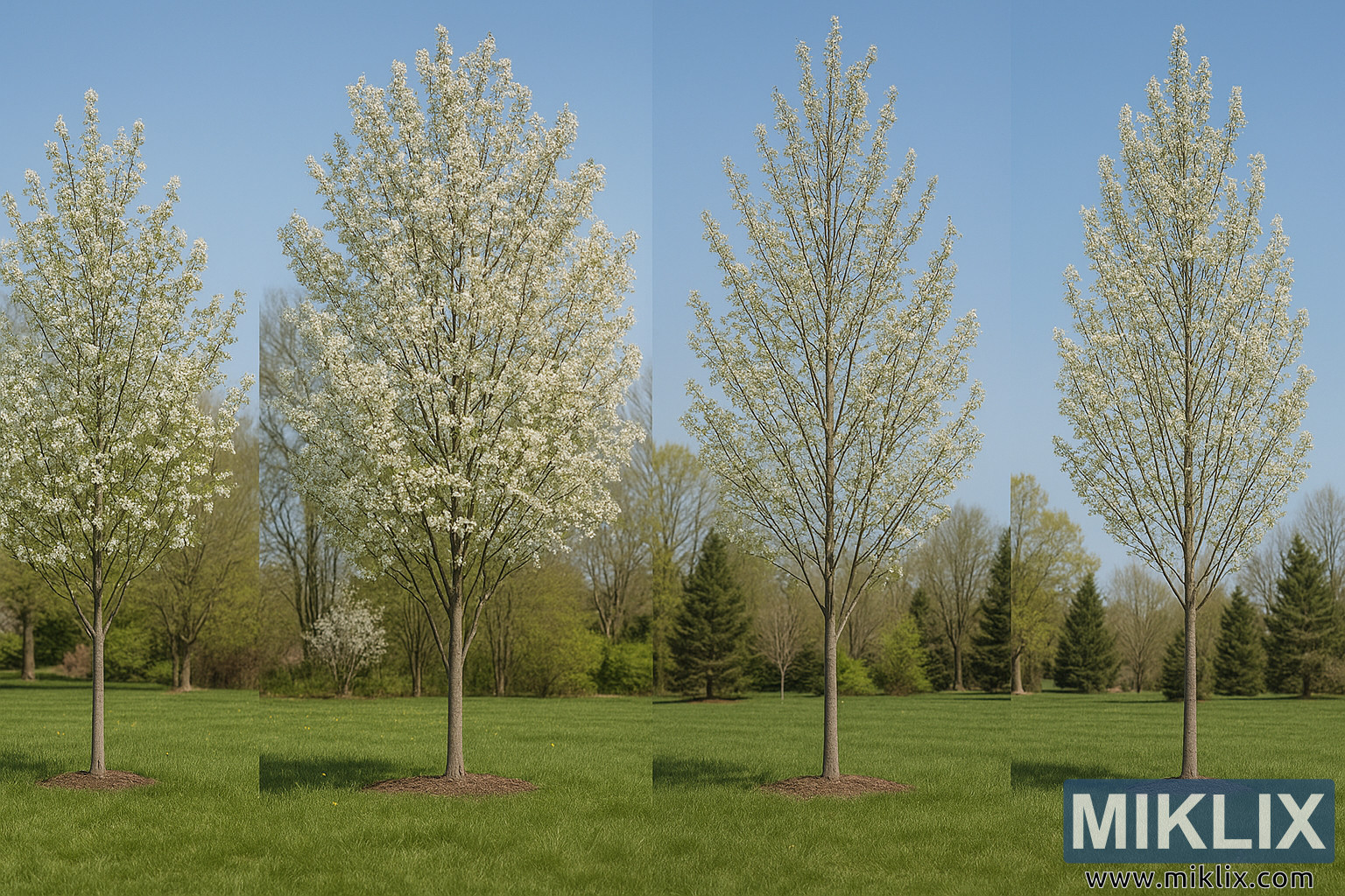 Cette photographie de paysage en haute résolution présente une étude comparative détaillée de quatre variétés distinctes d’amérique, alignées côte à côte dans un cadre de parc paisible. Chaque arbre est montré en pleine floraison au printemps, ses branches chargées de délicates fleurs blanches qui scintillent sous la lumière claire du jour. Le ciel bleu vif et les tons verts doux de la végétation environnante créent un décor idéal, soulignant les différences subtiles entre les espèces.
