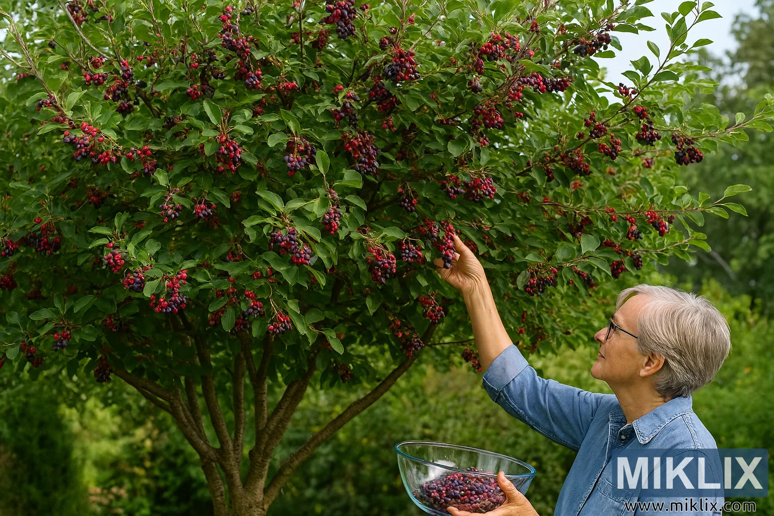 Harvesting Ripe Serviceberries from a Mature Tree