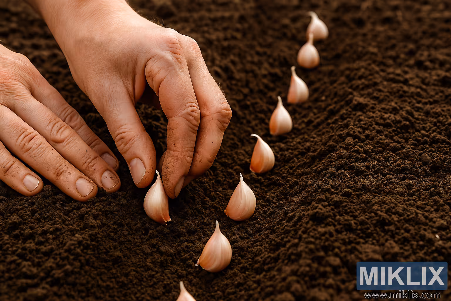 Une image détaillée en gros plan montrant des mains plantant des gousses d’ail individuelles à la bonne profondeur et en espacement dans un sol finement préparé.