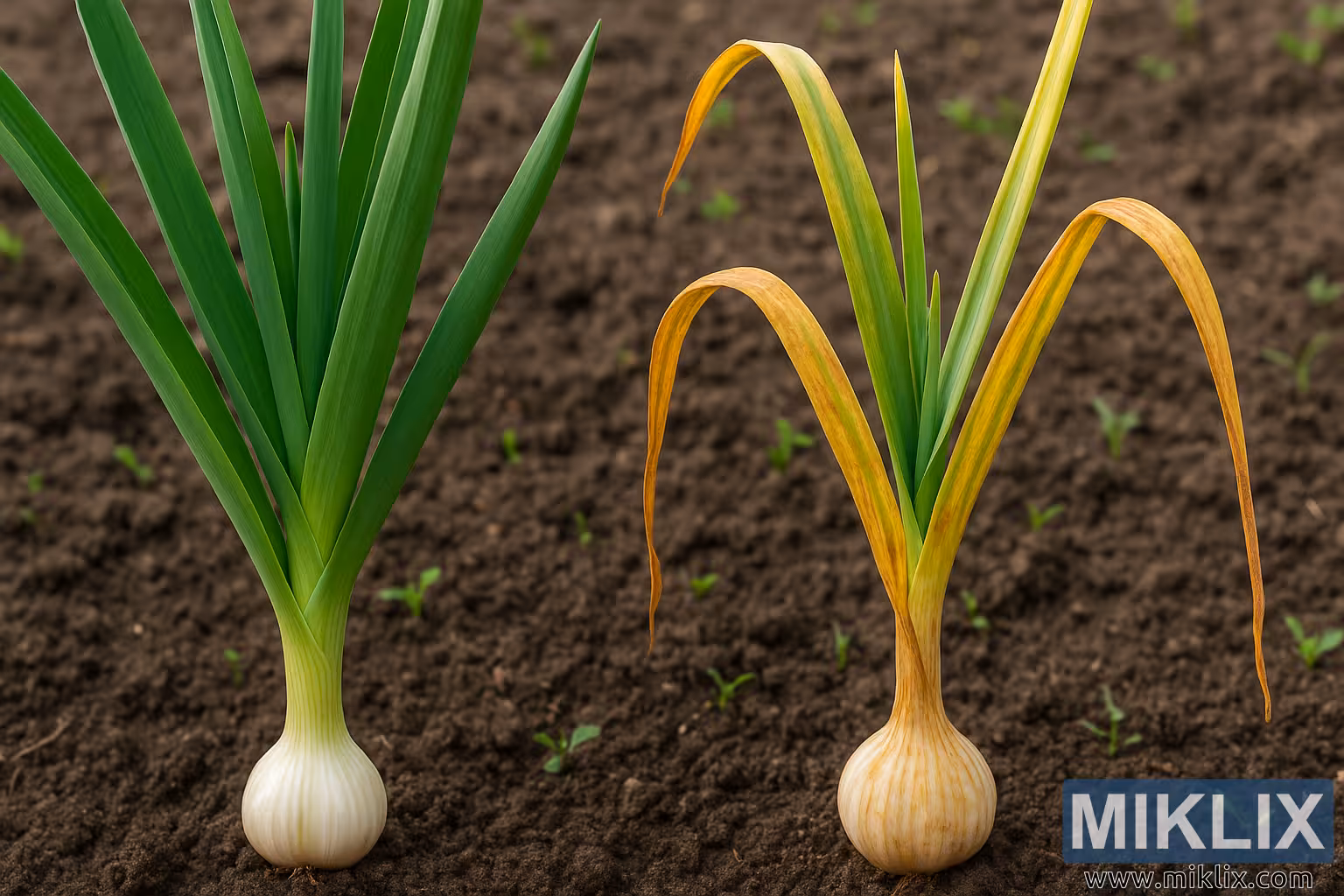 Une image comparative détaillée montrant un plant d’ail en santé à côté d’un autre atteint par une maladie, mettant en lumière les différences de couleur des feuilles, de vigueur et de santé globale des plantes.