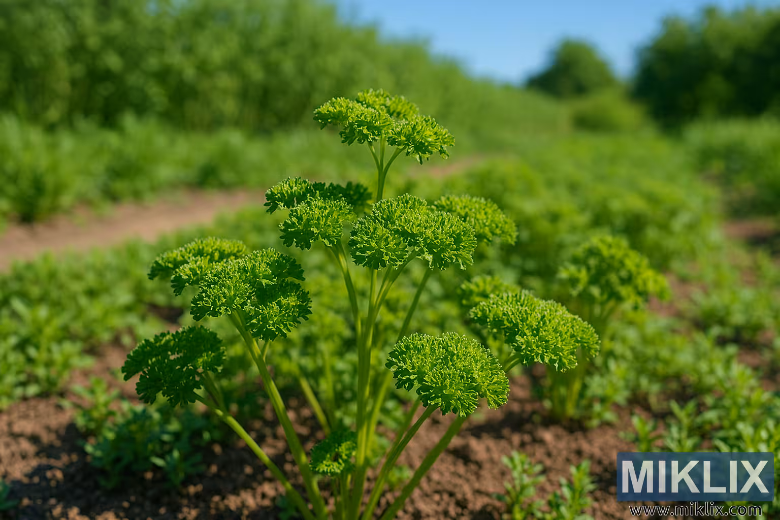 La composition est équilibrée et naturaliste, la plus haute plante de persil légèrement décalée, servant d’ancre visuelle. La faible profondeur de champ garantit que l’attention du spectateur reste sur le premier plan détaillé tout en transmettant l’ambiance vaste et paisible du jardin d’herbes aromatiques. L’image évoque un sentiment de fraîcheur, de croissance et d’abondance saisonnière, idéal pour un usage éducatif, culinaire ou promotionnel où le réalisme botanique et le contexte environnemental sont essentiels.