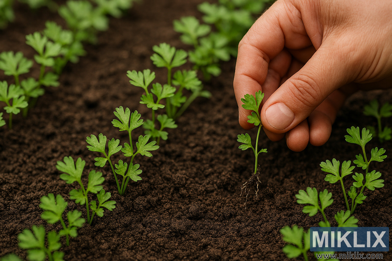 Cette photographie de paysage haute résolution capture un moment rapproché dans un potager où un jardinier éclaircit de jeunes semis de persil (Petroselinum crispum) pour assurer un bon espacement et une croissance optimale. L’image baigne d’une douce lumière naturelle, mettant en valeur les teintes vertes vibrantes des délicates feuilles de persil et les riches tons brun foncé du sol humide.