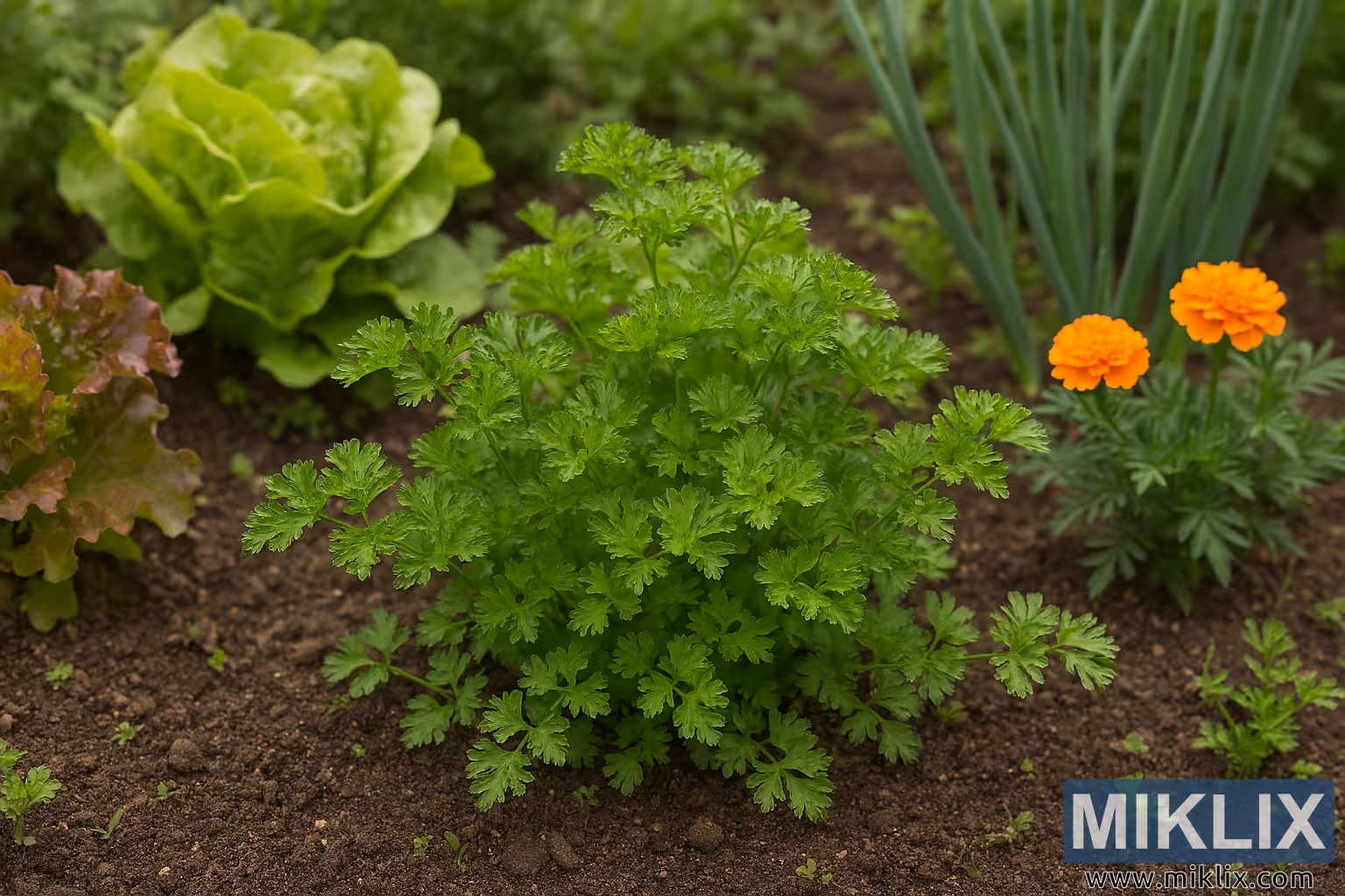 Cette image illustre un ensemble harmonieux de plantations compagnonnes, où le persil bénéficie de la présence de laitue, de soucis et d’oignons — des plantes connues pour repousser les nuisibles et favoriser une croissance saine. La scène transmet un sentiment d’équilibre, de vitalité et de cultivation attentive, idéale pour des récits visuels éducatifs, culinaires ou axés sur le jardinage.