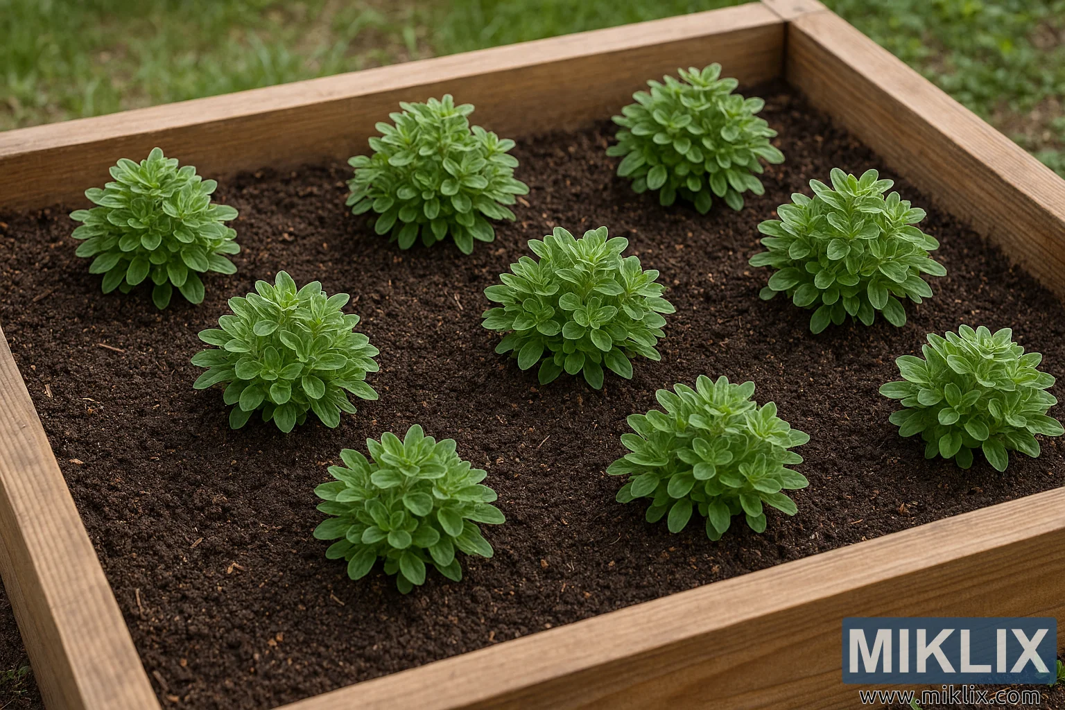 Photo de paysage haute résolution de plantes de marjolaine en santé, espacées uniformément dans un plate-bande surélevé, montrant des conditions de croissance optimales.