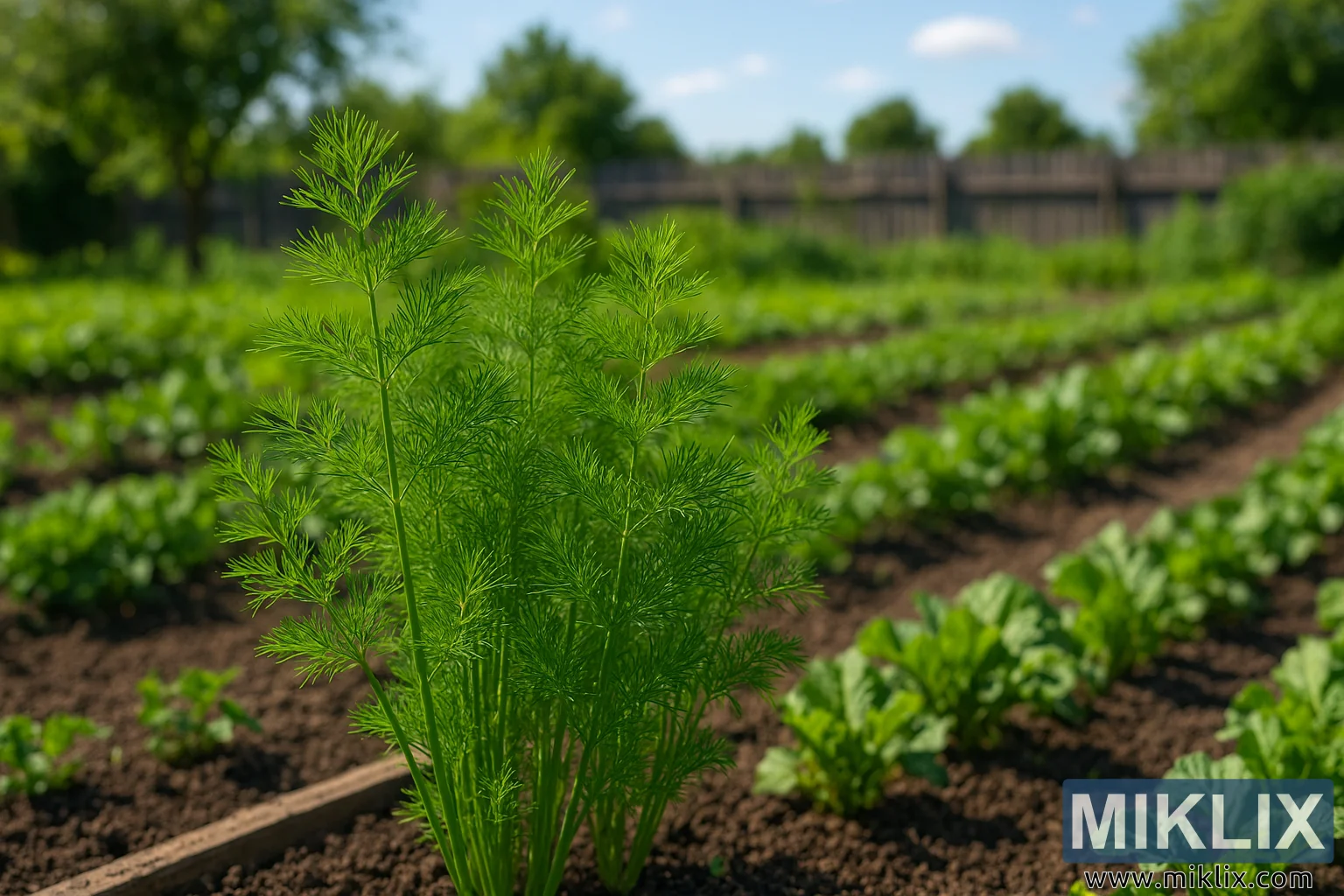 Image haute résolution de l’aneth Fernleaf prospérant dans un potager vibrant sous un soleil estival éclatant, entouré de rangées ordonnées de cultures et de terre riche.