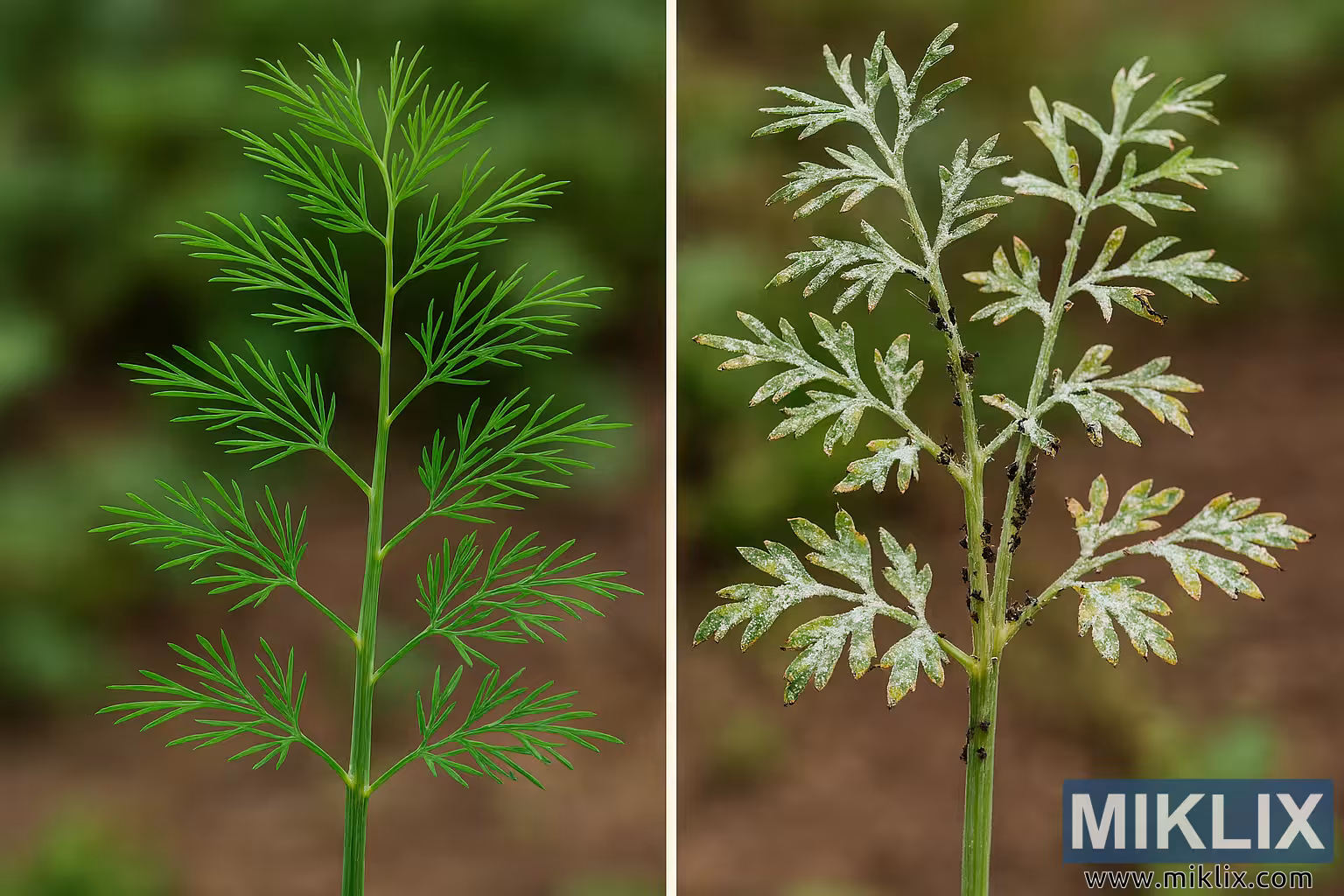 Image haute résolution montrant une plante d’aneth en santé à côté d’une autre souffrant de pucerons et d’oïdium, idéale pour l’éducation au jardinage et la sensibilisation à la santé des plantes.