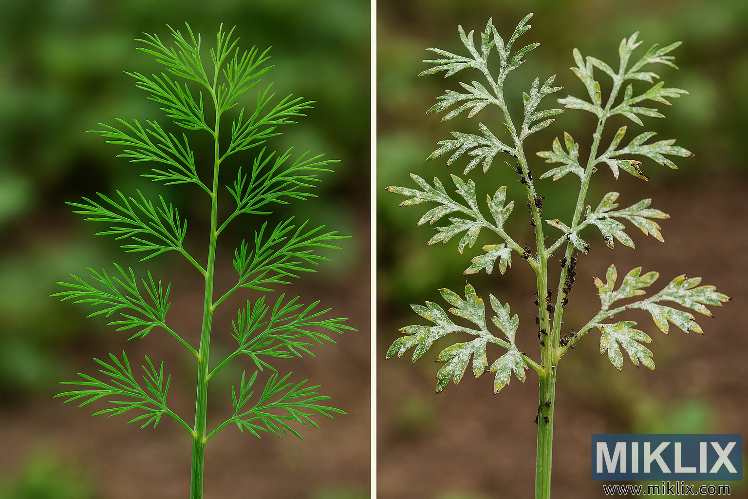 En revanche, le côté droit de l’image montre une plante d’aneth visiblement affectée par les pucerons et l’oïdium. La tige centrale, bien que tout aussi mince, paraît légèrement décolorée et est parsemée de grappes de petits pucerons noirs. Ces ravageurs sont concentrés près de la base des folioles et le long de la tige, perturbant visiblement l’intégrité de la plante. Les feuilles sont vert pâle à jaunâtre, beaucoup montrant des signes de recourbassement et de flétriment. Une substance blanche poudreuse — indicatrice de l’oïdium — est présente sur la surface des feuilles, particulièrement sur la partie supérieure. Cette infection fongique donne aux feuilles un aspect poussiéreux et contribue à leur texture et coloration malsaines. La structure générale de la plante est moins verticale et plus clairsemée, avec des espaces visibles dans le feuillage. L’arrière-plan de ce côté reflète celui de gauche, maintenant une constance dans le décor et l’éclairage, mais l’état de la plante contraste fortement avec son homologue sain.