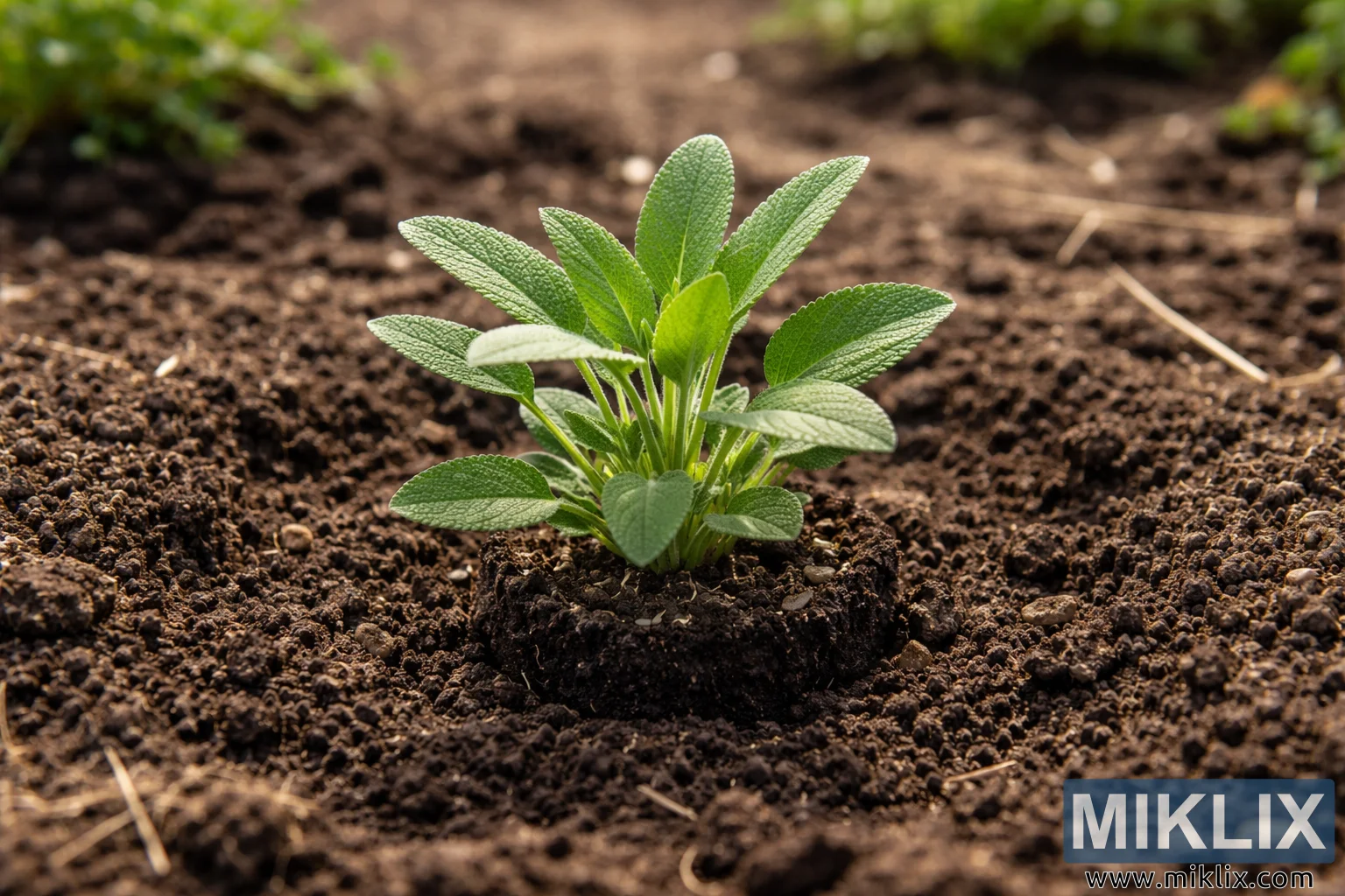 L’image représente une plante de sauge fraîchement transplantée dans un sol de jardin fraîchement travaillé, capturée dans un cadre naturel extérieur sous une lumière douce du jour. La composition est horizontale, avec le jeune sauge centré dans le cadre et le sol environnant s’étendant vers l’extérieur pour créer un sentiment d’espace et de contexte. La plante est petite mais en santé, avec plusieurs tiges dressées émergeant d’une motte de racinaires compacte partiellement visible au-dessus de la ligne du sol, indiquant qu’elle vient d’être plantée. Les feuilles sont allongées et ovales, caractéristiques de la sauge commune (Salvia officinalis), avec une surface légèrement texturée et veloutée. Leur couleur varie du vert moyen à un vert argenté atténué, captant la lumière d’une manière qui met en valeur leur duvet fin et leurs veines subtiles. Les feuilles paraissent fermes et bien hydratées, suggérant un arrosage récent ou des conditions de sol humides. Le sol lui-même est brun foncé et friable, avec un aspect riche et organique. De petites mottes, granules et fragments de matière organique sont visibles partout, renforçant l’impression de terre de jardin fraîchement préparée. Le sol autour de la base de la plante forme une dépression peu profonde, typique d’un trou de transplantation qui vient d’être comblé, aidant ainsi à retenir l’eau autour des radics. En arrière-plan, le sol s’adoucit graduellement en un flou doux, avec de légères traces d’autres rangées plantées ou de basses feuilles parallèles au sujet principal. Cette faible profondeur de champ attire l’attention du spectateur sur la plante de sauge tout en transmettant l’environnement plus large du jardin. L’éclairage est naturel et uniforme, sans ombres dures, suggérant une journée couverte ou un soleil filtré. Dans l’ensemble, l’image transmet un moment calme et ancré dans le jardinage : le début de l’établissement d’une plante dans le sol, symbolisant la croissance, le soin et le début d’un jardin d’herbes aromatiques productif.