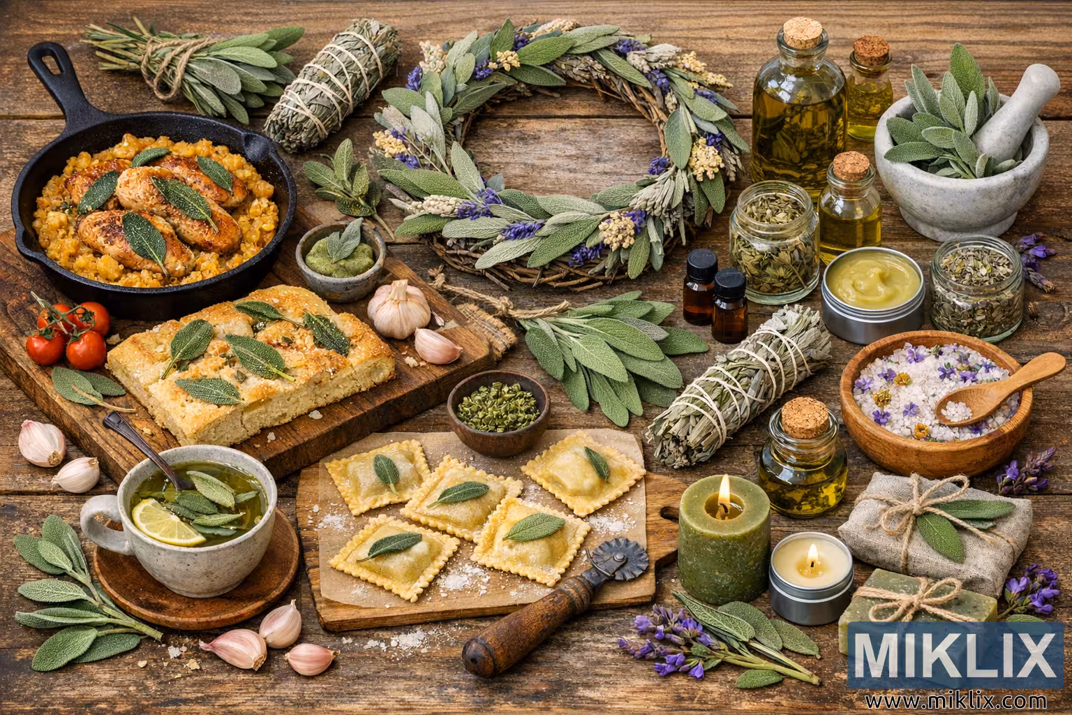 L’image présente une nature morte richement détaillée, orientée vers le paysage, disposée sur une table en bois usé, célébrant la polyvalence de la sauge à travers les traditions culinaires, artisanales et médicinales. Au centre et s’étendant à travers le cadre se trouve une abondante exposition de feuilles de sauge fraîches, leur texture douce et argentée vert répétée sous plusieurs formes pour créer une cohésion visuelle. Les usages culinaires sont mis en avant : une poêle en fonte contient du poulet rôti doré niché sur un lit de grains, chaque morceau garni de feuilles de sauge croquantes. À proximité, la focaccia fraîchement cuite est coupée en carrés épais et garnie de sauge, de sel grossier et d’huile d’olive, mettant en valeur un plat rustique réconfortant. Les raviolis faits à la main reposent sur une planche de bois saupoudrée de farine, chaque coussin de pâtes orné d’une seule feuille de sauge, suggérant une préparation soignée et une cuisson artisanale. Une tasse en céramique de thé à la sauge avec des tranches de citron est posée à proximité, accompagnée de feuilles libres et de gousses d’ail, renforçant le rôle de l’herbe tant dans la saveur que dans le bien-être. Au-delà de la nourriture, l’image se transforme en artisanat et traditions familiales. Des bouquets de sauge séchée attachés avec de la ficelle sont disposés autour de la scène, certains empilés soigneusement, d’autres disposés de façon décontractée, évoquant les pratiques de séchage à base de plantes. Une couronne tissée décorée de sauge et de petites fleurs violettes forme un point focal circulaire, symbolisant la décoration saisonnière et l’art artisanal. De petites bouteilles en verre remplies d’huile infusée à la sauge captent la lumière, leurs tons dorés et chauds contrastant avec les feuilles vertes et fraîches. Les bocaux à proximité contiennent des mélanges de sauge séchée et d’herbes, suggérant des thés, des onguents ou des assaisonnements culinaires. Les usages médicinaux et de soins personnels sont représentés par des savons faits main enveloppés dans un tissu naturel, une boîte de baume vert pâle, et un bol de sels de bain mélangés à des herbes et des pétales de fleurs. Un mortier en pierre rempli de sauge fraîche renforce l’idée des méthodes traditionnelles de préparation. Des chandelles aux teintes vertes atténuées ajoutent chaleur et un sentiment de calme, leur douce lueur accentuant l’atmosphère terreuse. Tout au long de la composition, des matériaux naturels comme le bois, la pierre, le verre et le lin dominent, créant une esthétique organique ancrée dans la réalité. L’éclairage est doux et naturel, mettant en valeur les textures et les couleurs sans contraste brutal. Dans l’ensemble, l’image transmet abondance, tradition et créativité, illustrant comment la sauge s’entrelace entre la cuisine, l’artisanat et les pratiques de guérison dans un tableau harmonieux et visuellement invitant.