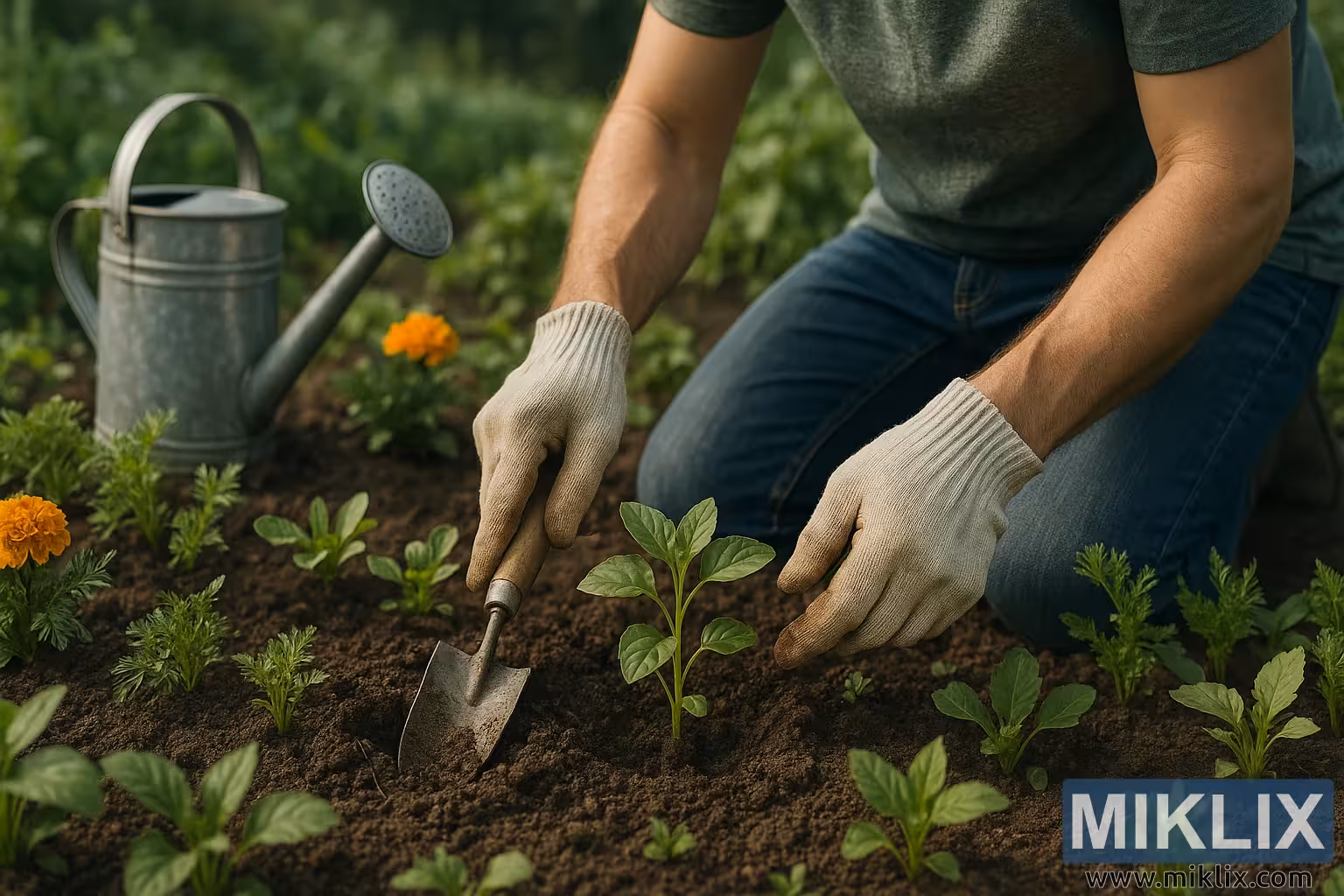 Un jardinier s’agenouille dans le sol, plantant un semis feuillu parmi les soucis avec un arrosoir à proximité, capturant une scène de jardinage sereine et nourrissante.
