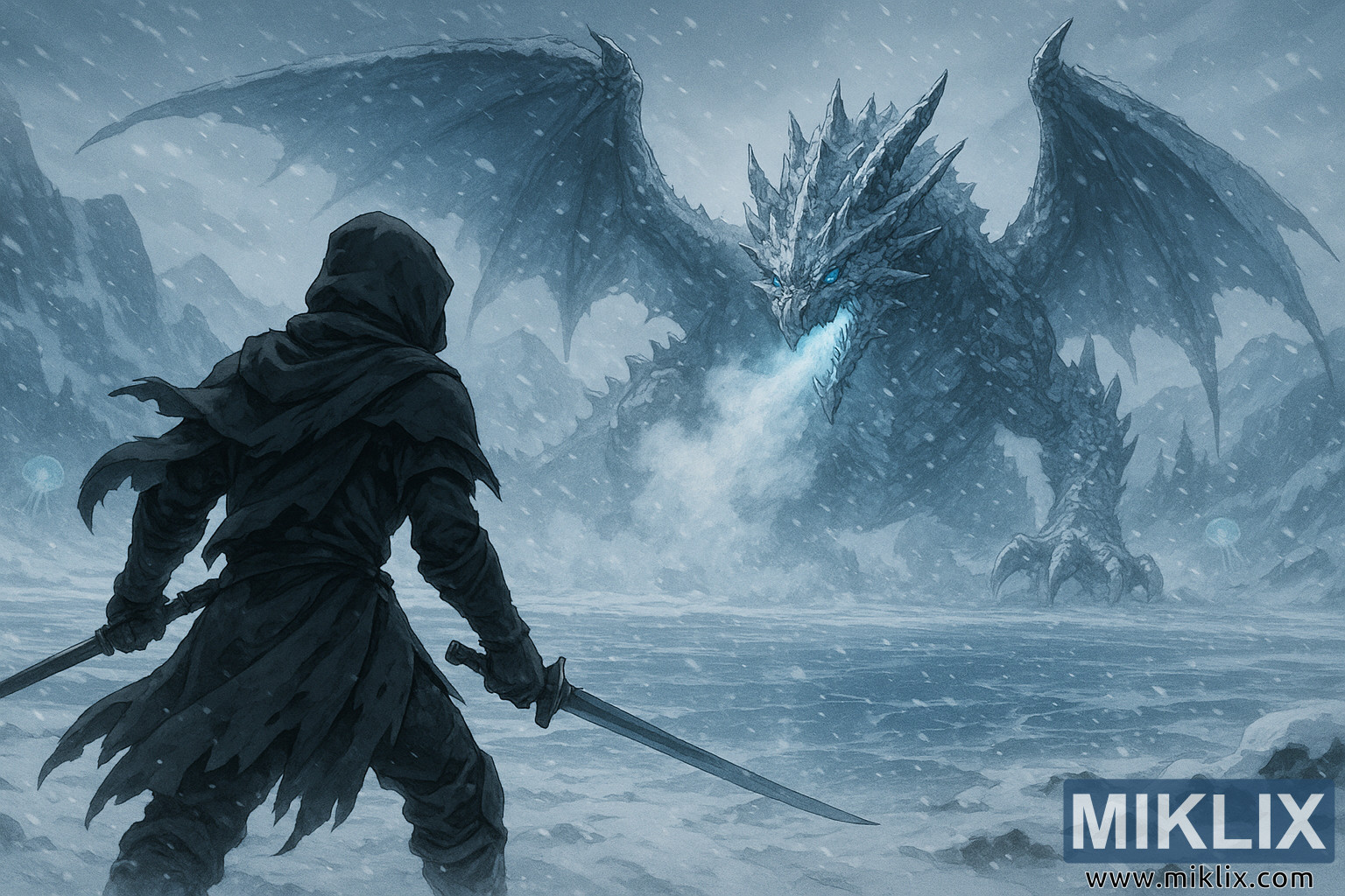 Œuvre d’art de style anime de paysage représentant un guerrier ressemblant à Black Knife vu de dos, debout avec deux katanas sur un lac gelé et affrontant le dragon de givre Borealis au milieu de la neige tourbillonnante et de méduses lumineuses au loin.