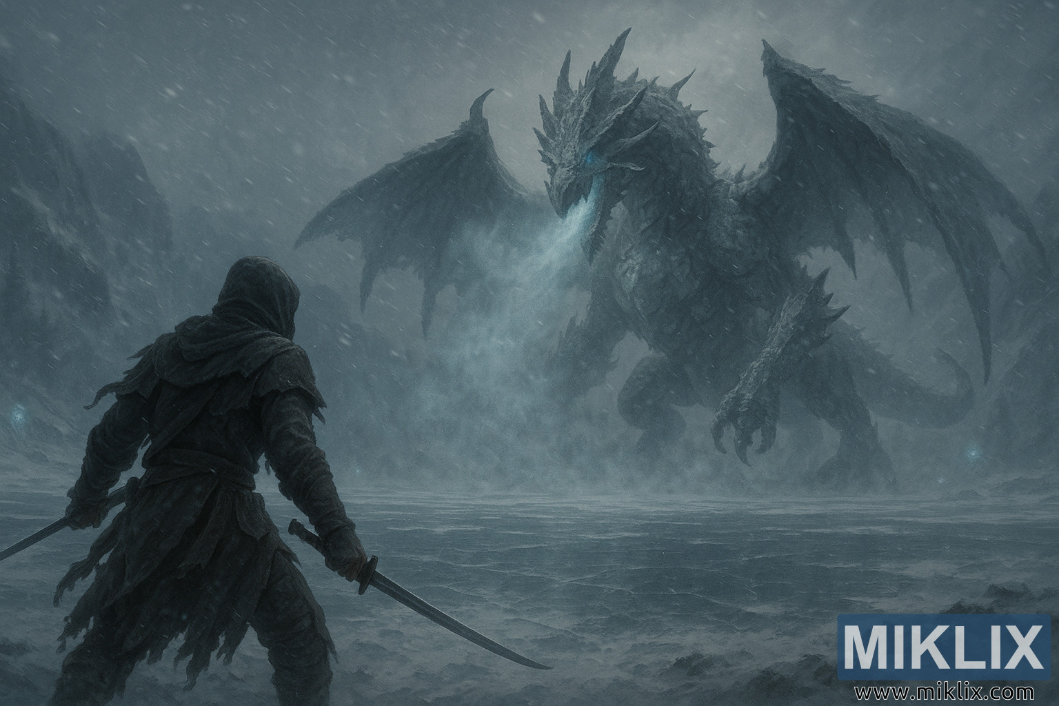 Cette peinture numérique semi-réaliste dépeint une confrontation ambitieuse et ambitieuse entre un guerrier solitaire et un immense dragon de givre à travers l’étendue vaste d’un lac gelé. La caméra est reculée plus loin qu’avant, montrant non seulement les personnages, mais aussi l’immense environnement impitoyable qui les entoure. La composition est large et cinématographique, mettant en valeur la désolation, le temps hostile et la différence d’échelle frappante entre le guerrier et le dragon monstrueux.