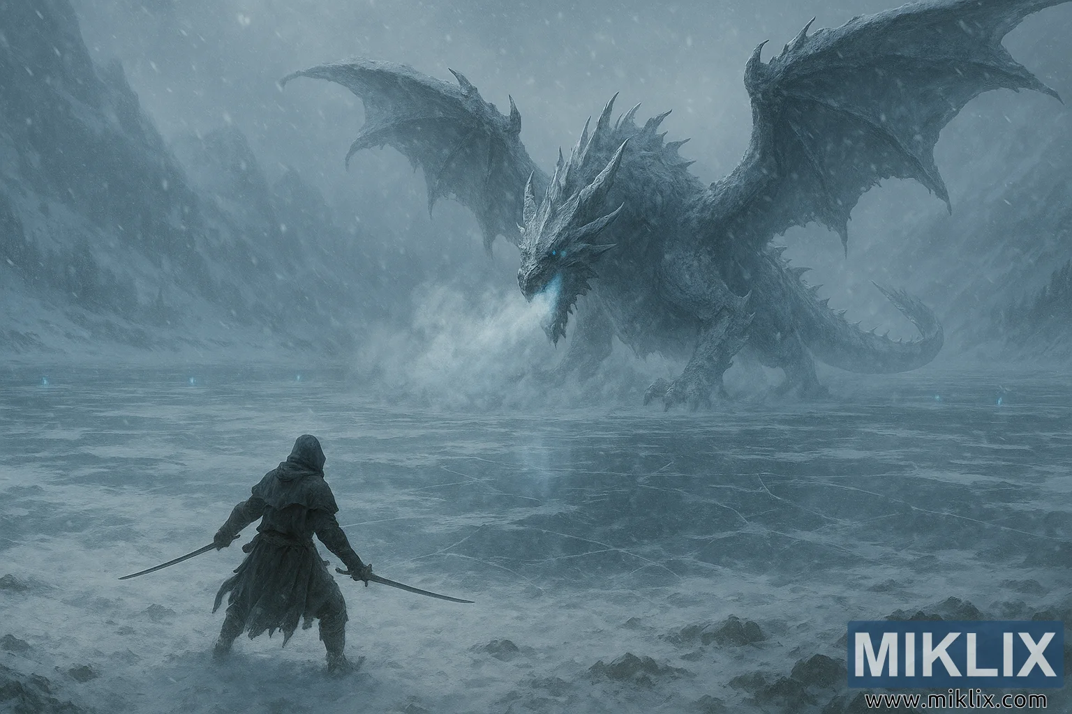 Cette peinture numérique semi-réaliste dépeint une confrontation écrasante et monumentale au bord d’un vaste lac gelé, au cœur d’une tempête de neige incessante. L’angle de caméra surélevé, partiellement en plongée, met en valeur l’immense échelle du paysage glacé et rend la différence de taille entre le guerrier solitaire et le gigantesque dragon de givre dramatique. Toute la composition place le spectateur presque dans la position d’un observateur aérien, regardant en bas l’étendue étendue de glace fissurée et de neige.