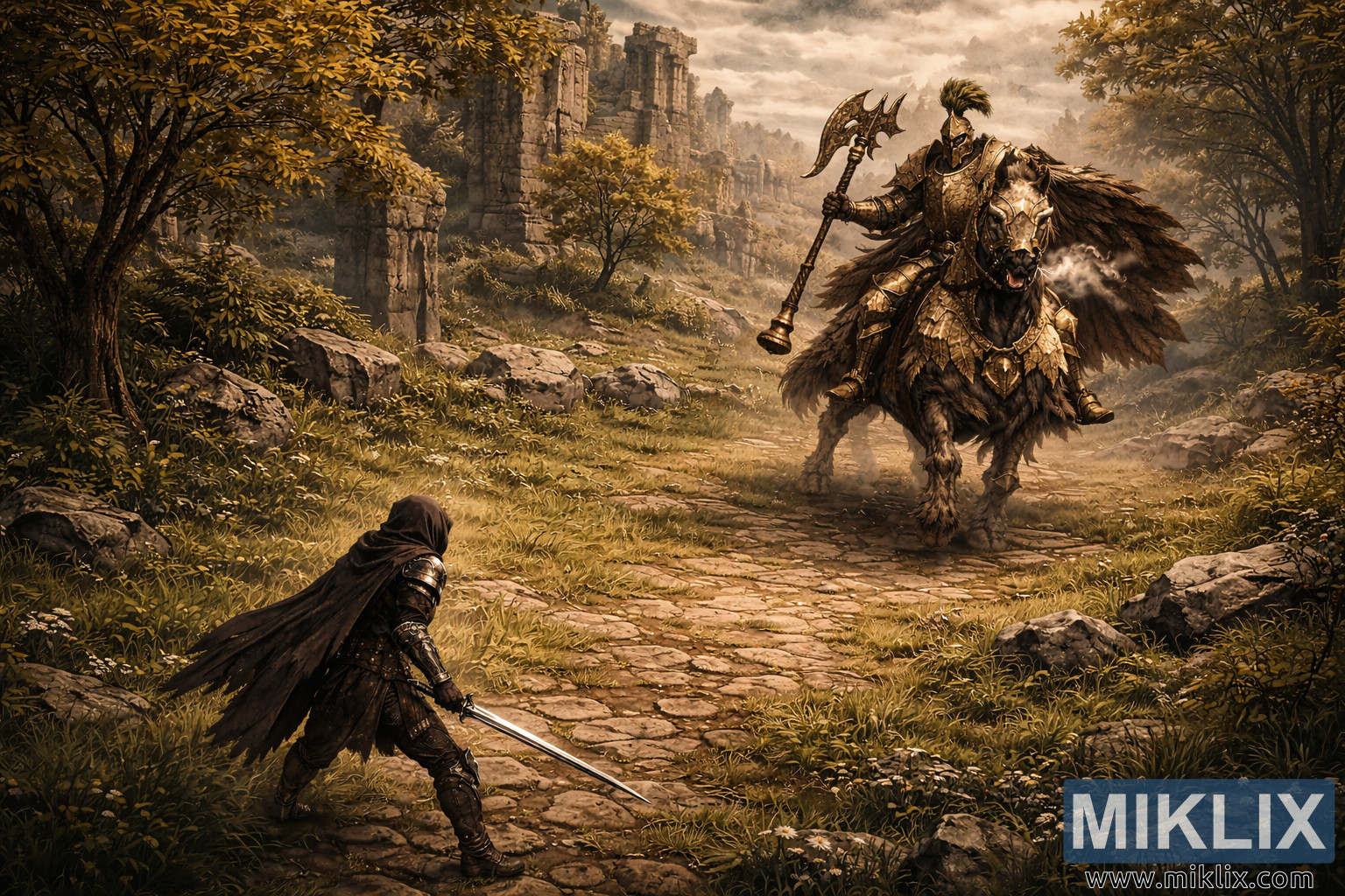 Illustration numérique semi-réaliste de fantasy vue sous un angle isométrique représentant un épéiste encapuchonné s’approchant d’un énorme chevalier doré sur un cheval cuirassé parmi des ruines anciennes et des arbres d’automne.
